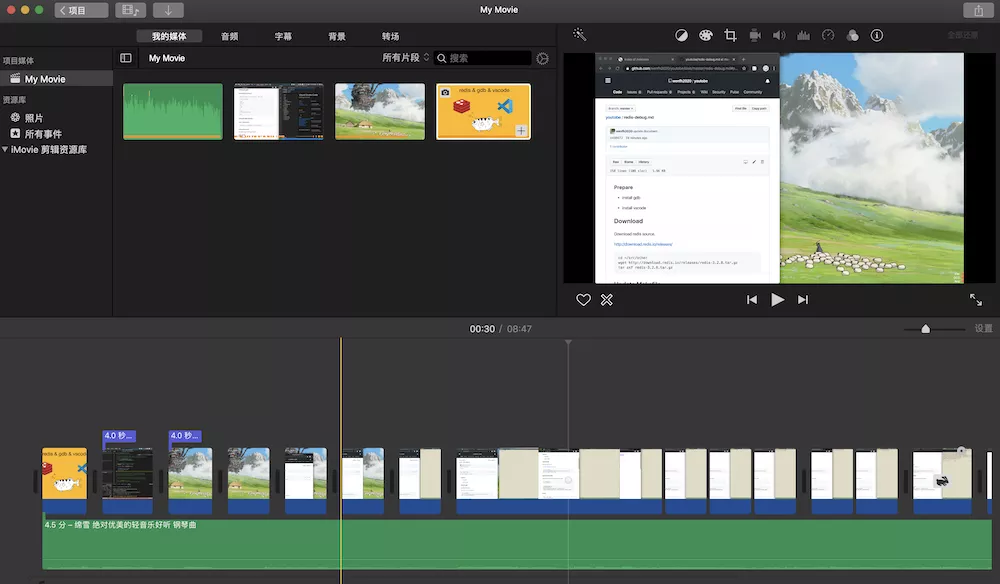 看过网红李子柒的片基本都是 10 分钟左右 …,——我是菜鸟,初衷只想把冗余的片段删除,又不想把自己的声音录进去,向网红学习,搞了首轻音乐作为背景音乐。20 分钟的片剪到 9 分钟,前后剪了大半天~。没办法,剪完以后,还得从头到尾自己看一次,检查是否正常。