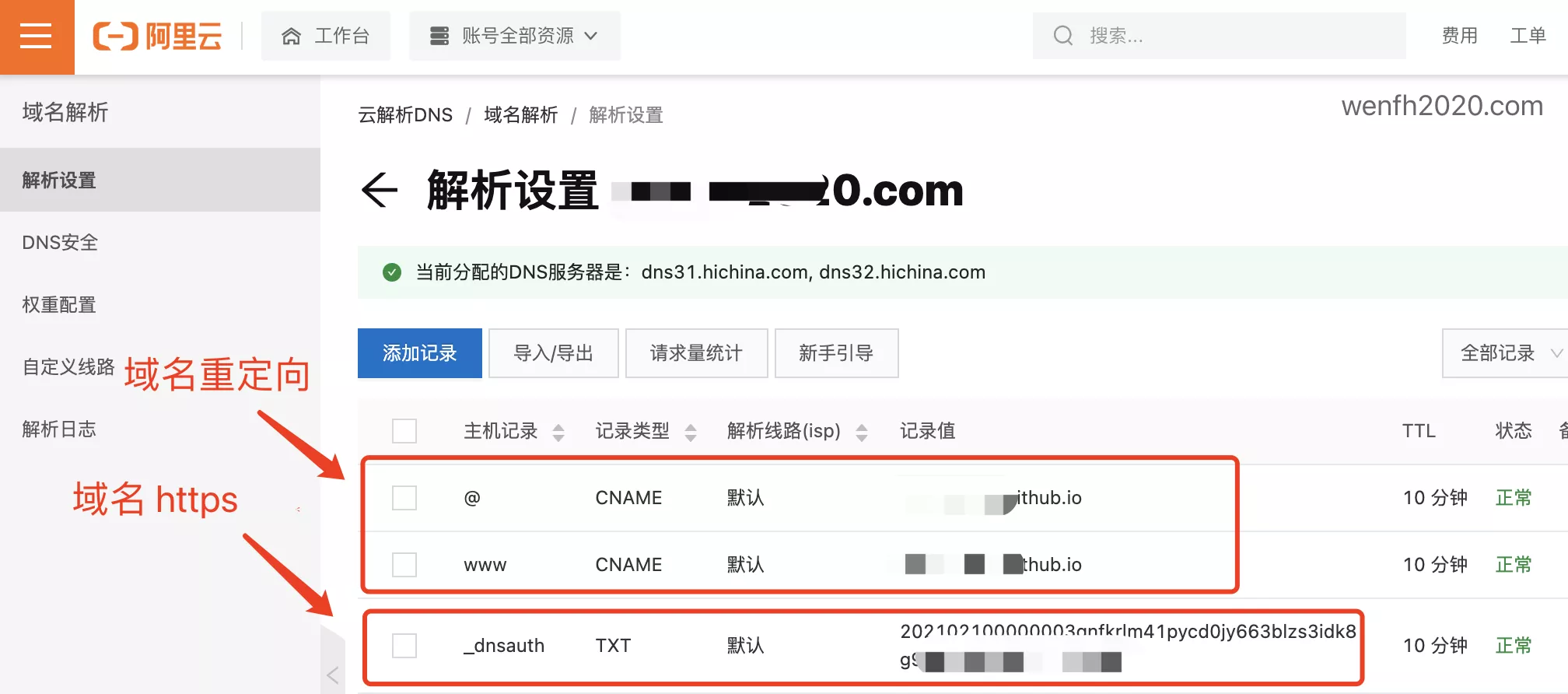 - 阿里云域名重定向,将购买的域名重定向到你的 xxx.github.io 域名。