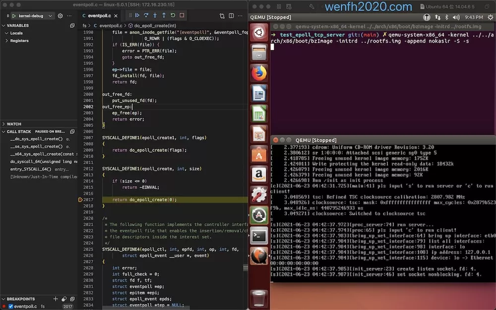 - vscode 在 Linux 内核源码的 eventpoll.c 文件,对对应接口(epoll_create, epoll_wait, epoll_ctl)下断点。