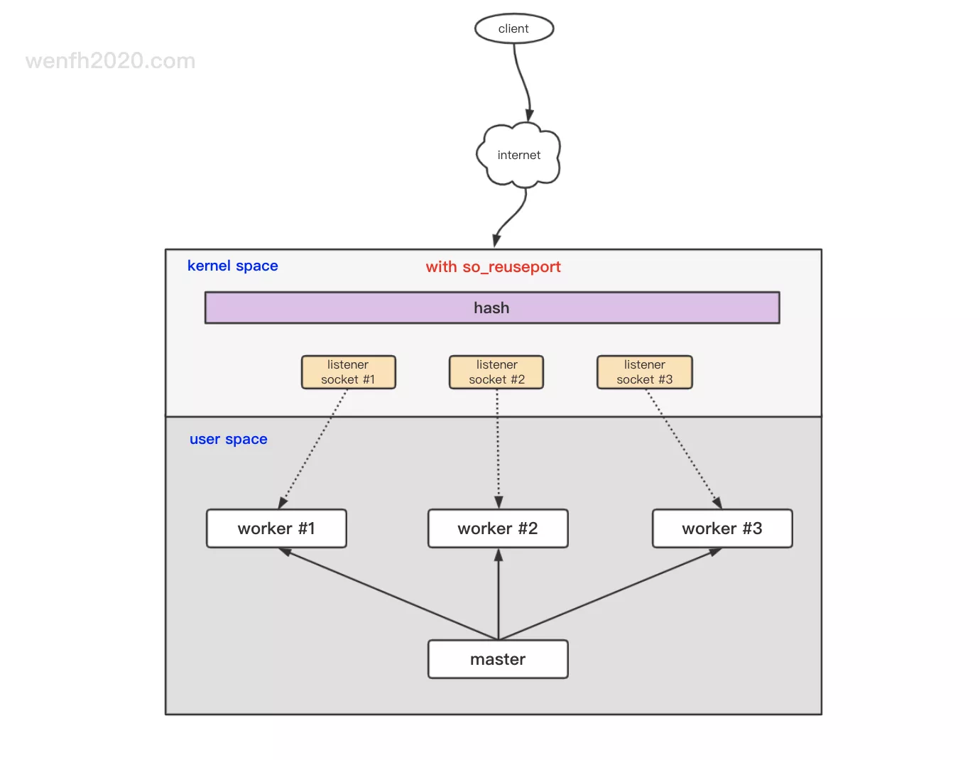 内核通过哈希算法,将新链接相对均衡地分配到各个开启了 reuseport 属性的进程,所以资源的负载均衡得到解决。