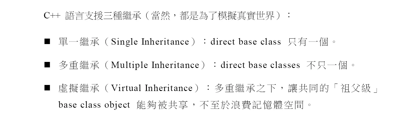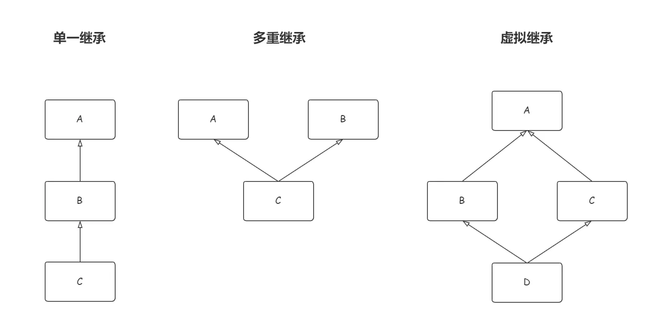 封装,继承,多态是 C++ 的三大特性,其中多态与继承有密切关系。C++ 语言支持三种继承关系:单一继承,多重继承,虚拟继承: