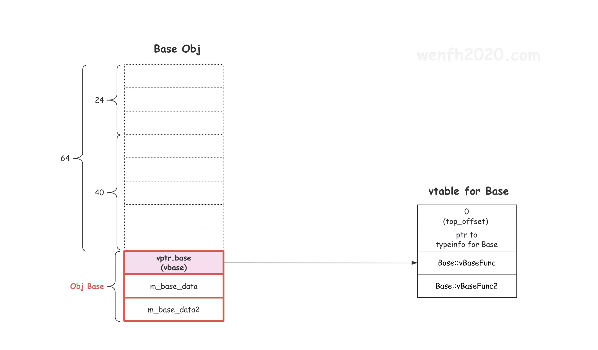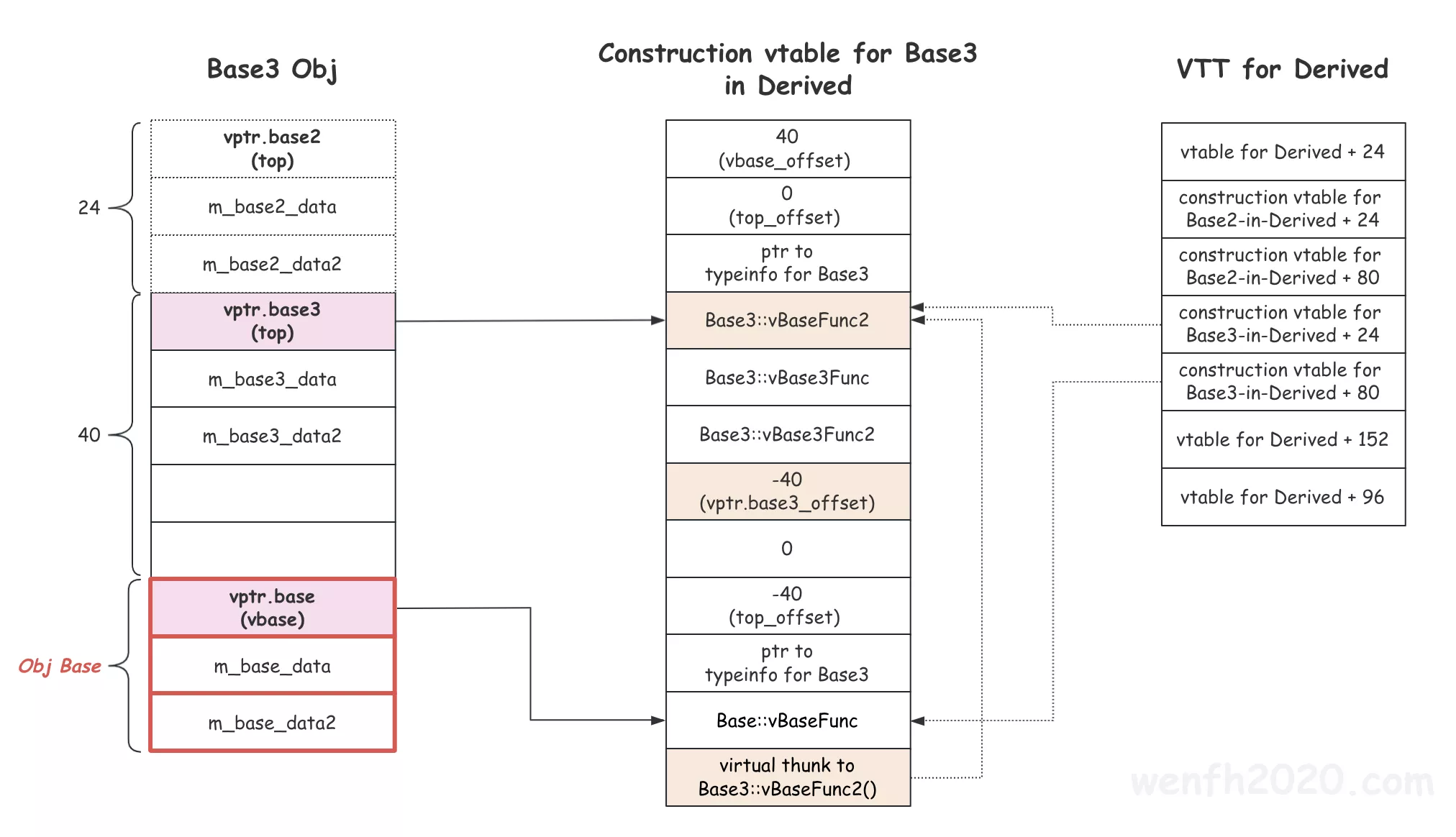 - b 指针指向存储 vptr.base3 的地址:从 Derived 对象内存顶部向高地址偏移 0x18 个字节。