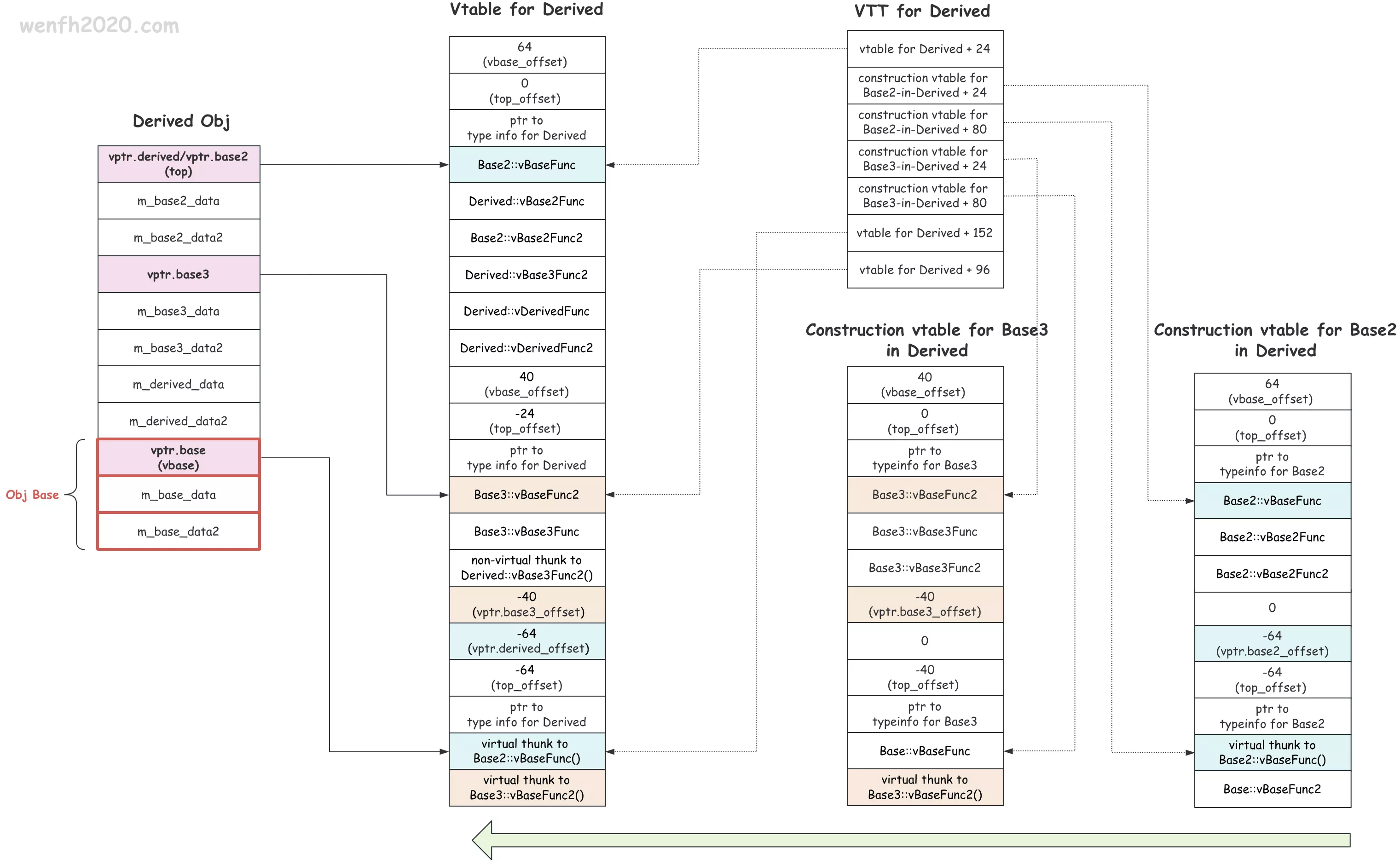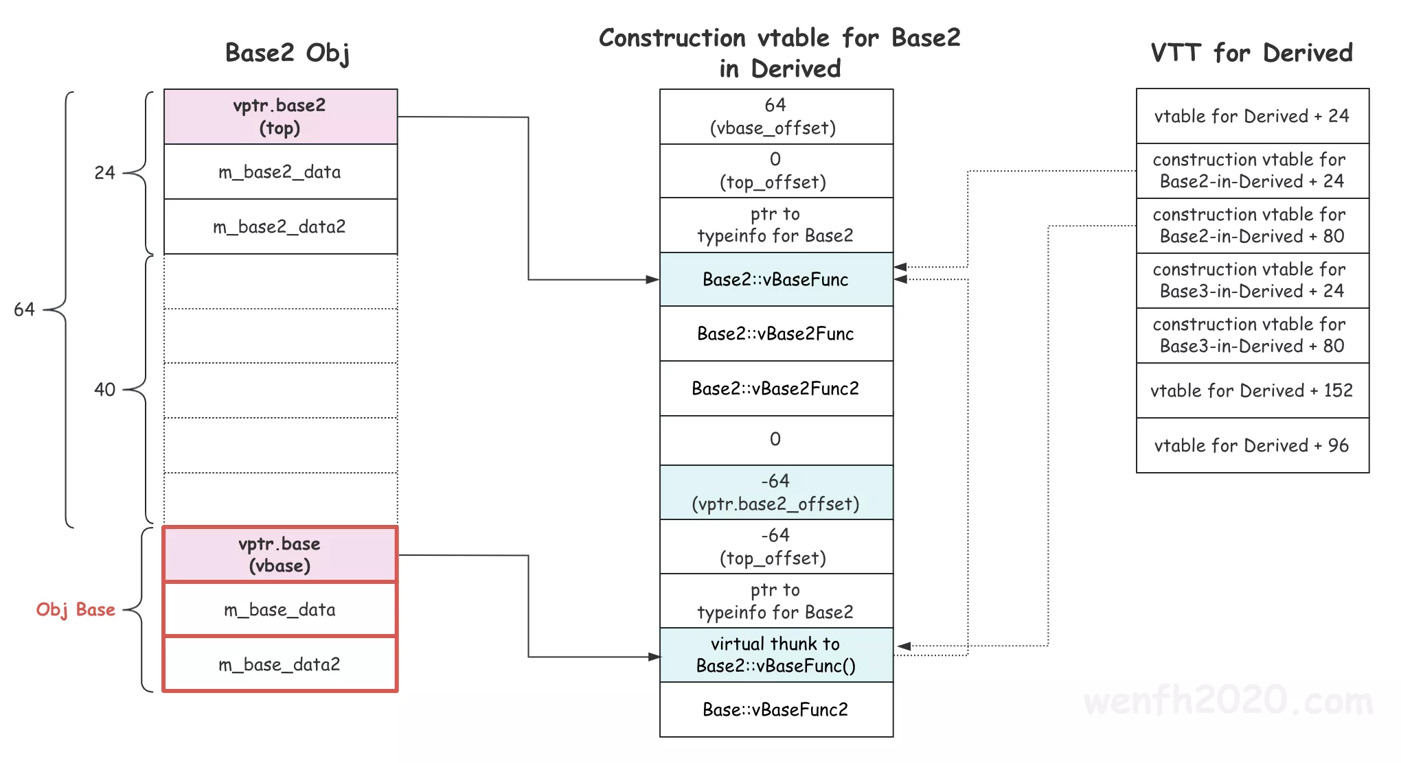 我们可以通过类的构造顺序去理解:对象内存布局如何一步一步构造出来的。在构造派生类 Derived 时,先构造基类,当基类构造完了,才构造自己。