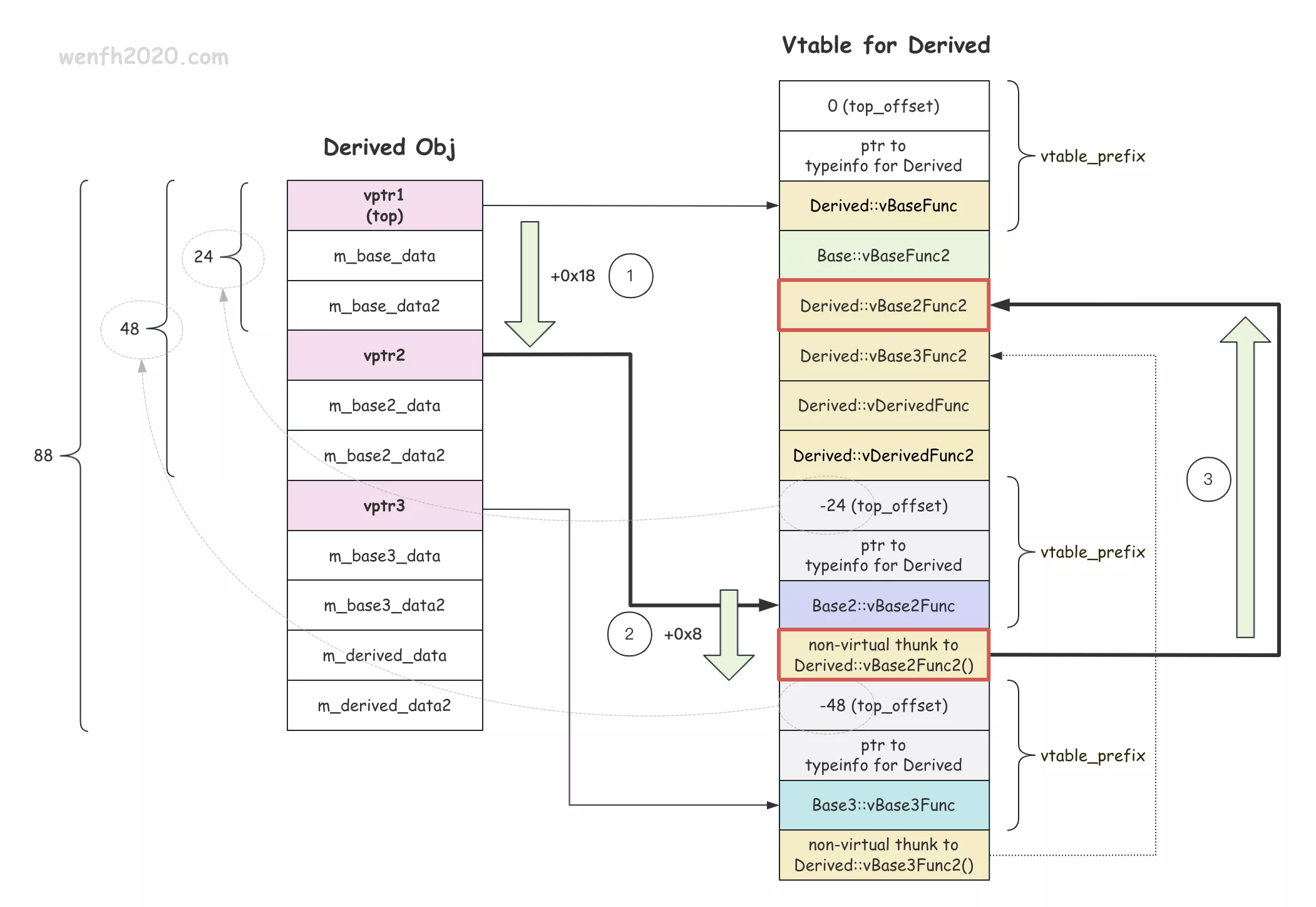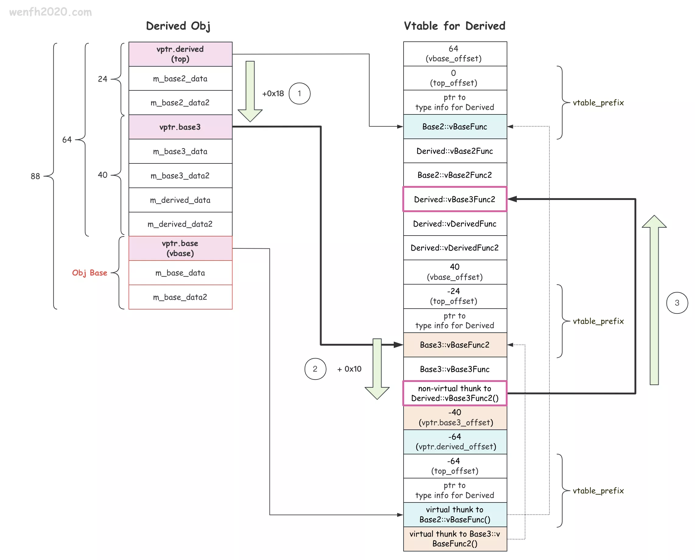 - vptr.base3 指针指向的虚表地址向高地址偏移 0x10 个字节,获得 non-virtual thunk to Derived::vBase3Func2() 函数地址。