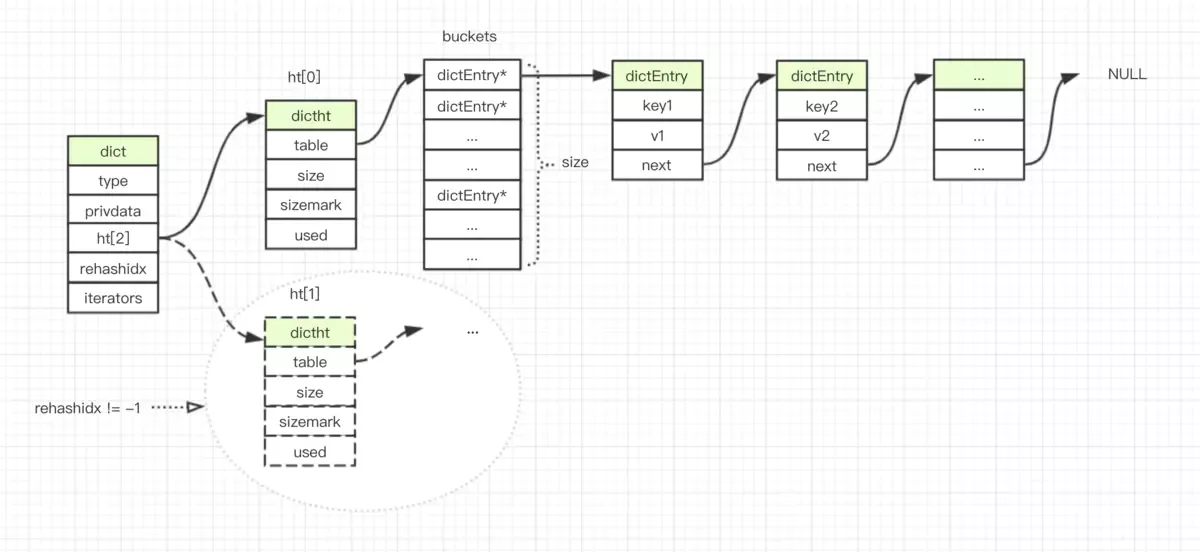因为 redis 是单进程服务,所以当数据量很大时,扩容/缩容这些内存操作,涉及到新内存重新分配,数据拷贝,必然会影响服务质量。redis 作者采用了渐进方式,将一次性操作,分散到 dict 对应的各个增删改查操作里,每个操作触发有限的数据迁移。所以 dict 会有两个哈希表(dictht ht[2];),相应的 rehashidx 迁移位置,方便数据迁移。