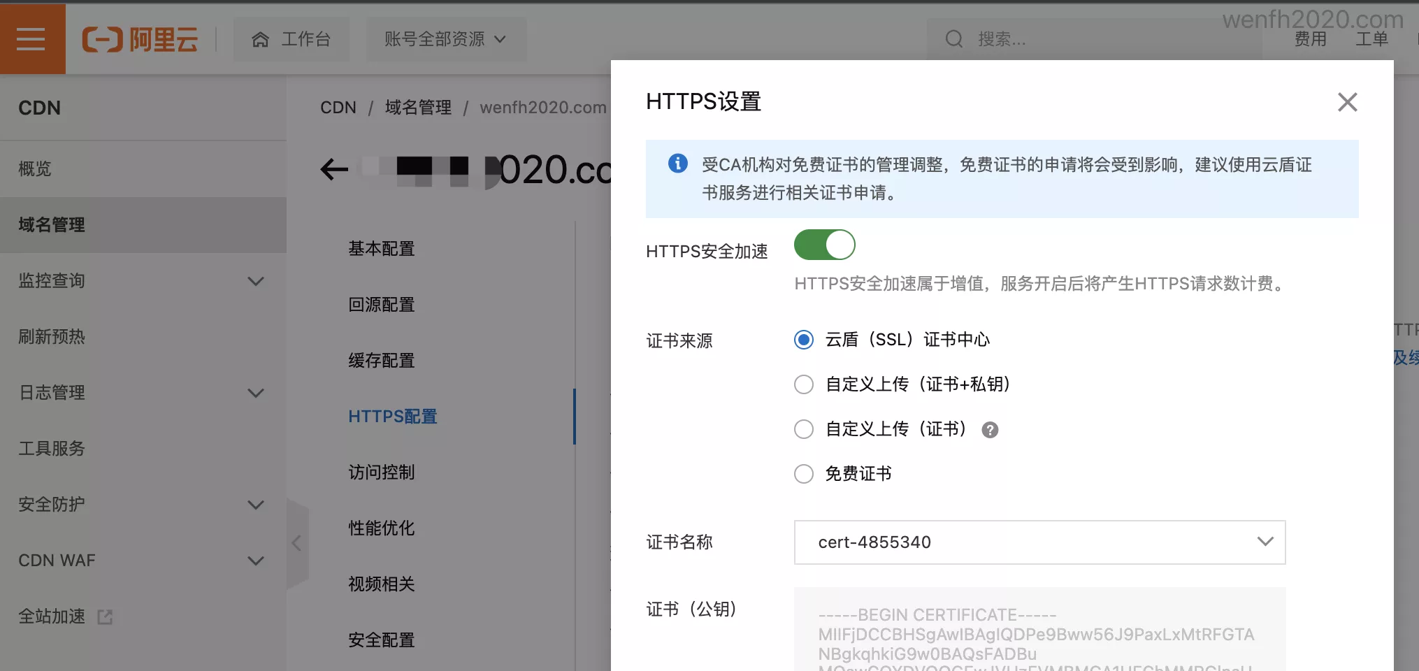 - CDN 加速,设置 https,选择已申请的免费 https。