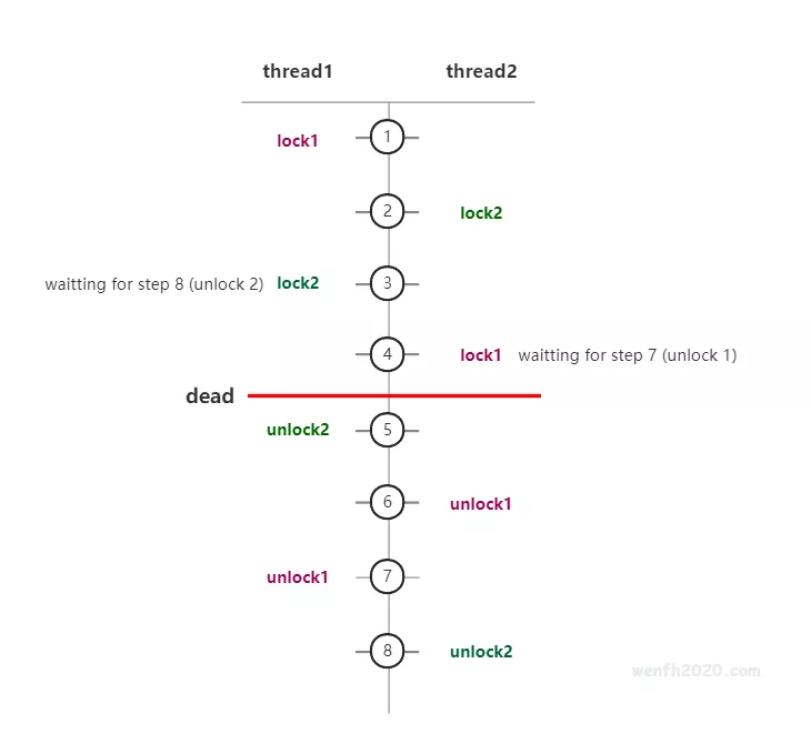 下图展示了同时运行的两个线程,极有可能产生嵌套死锁问题。