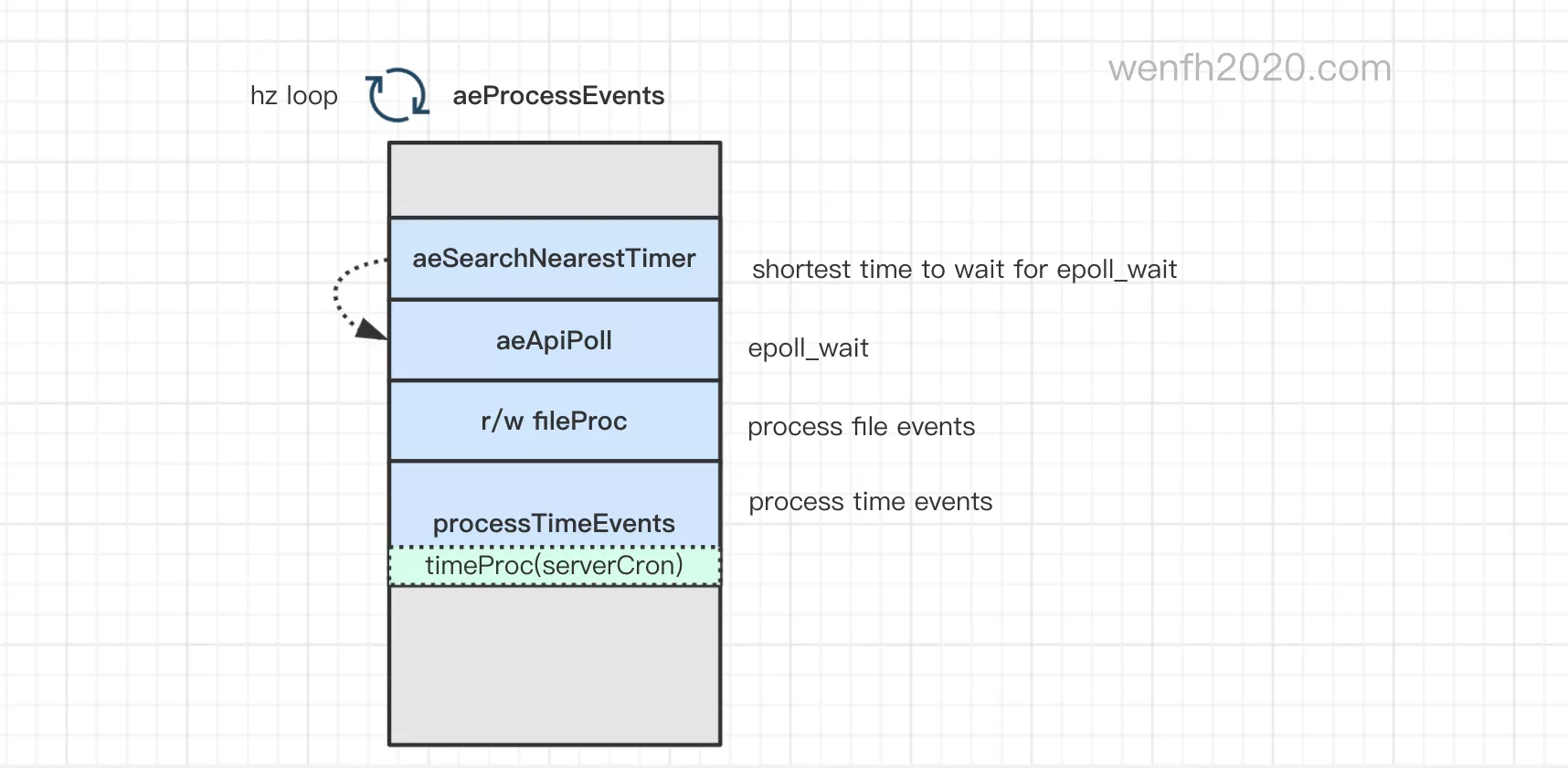 timeProc,例如 redis 对应的处理函数serverCron。serverCron返回下一次到期的时间间隔,事件到期时间被(aeAddMillisecondsToNow)修改延后一个时间间隔,下一次到期再重新执行,从而达到时钟定期执行的效果。