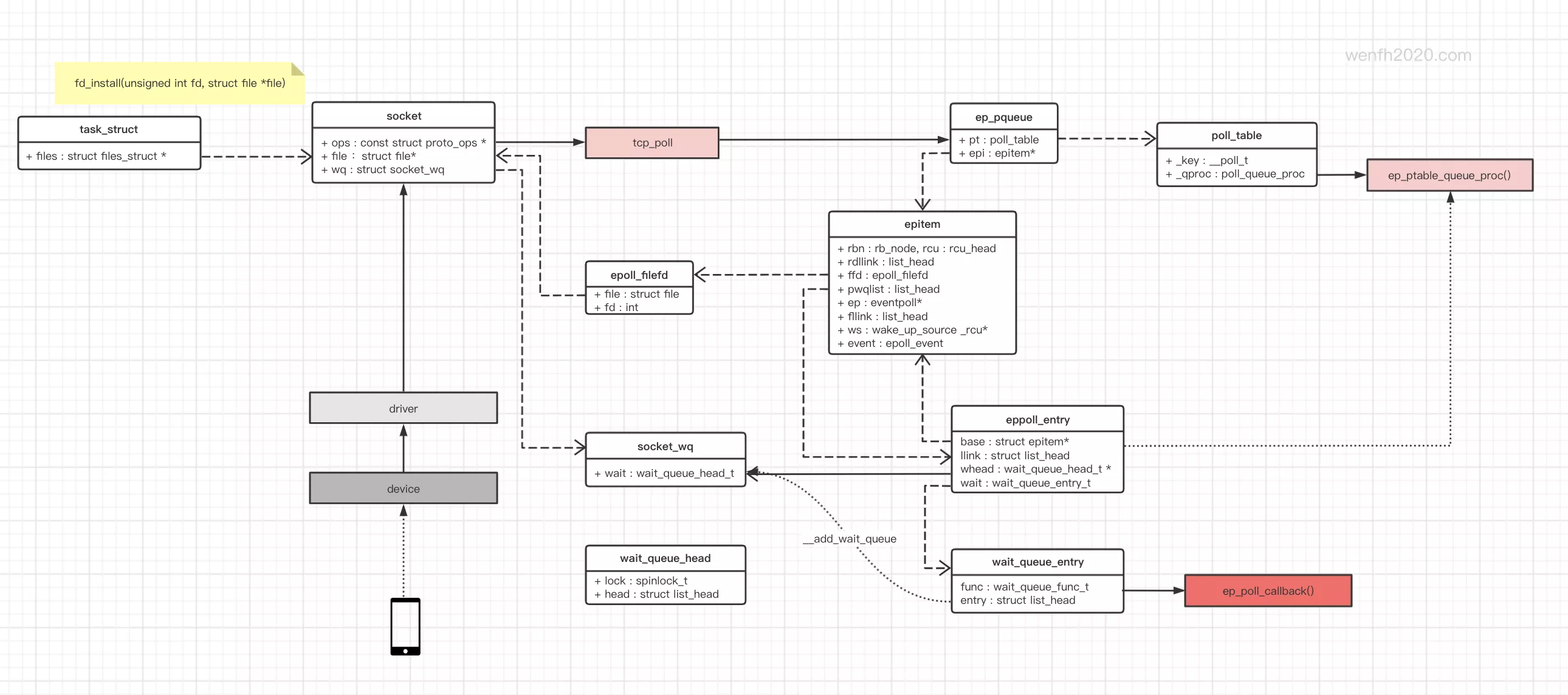 // ep_ptable_queue_proc 增加等待队列并将 socket 与 ep_poll_callback 回调建立联系。