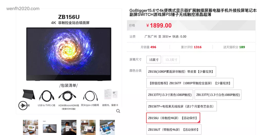 品牌 型号 重量 分辨率 刷新频率 价格 Gobigger ZB156U(非触控 4k 屏) 678 g 3840 * 2160 60 hz ¥ 1899