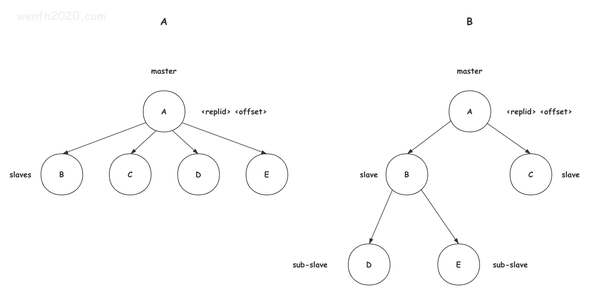 - A 图,主从节点间数据复制实时性较好,但是如果 slave 节点数量多了,master 复制数据量就会增大,特别是全量复制场景,对 master 性能影响比较大。