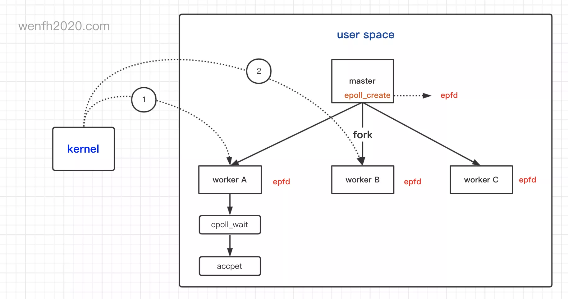 当多个进程共享同一个 “epoll fd” 时,多个进程同时在等待资源,也就是多个进程通过 epoll_wait 将自己当前进程的等待事件挂在内核 epoll 实例 eventpoll.wq 等待队列上,换句话说,eventpoll.wq 等待队列上挂着多个多个进程的等待事件,当某个事件触发时,等待队列上的进程会被唤醒。