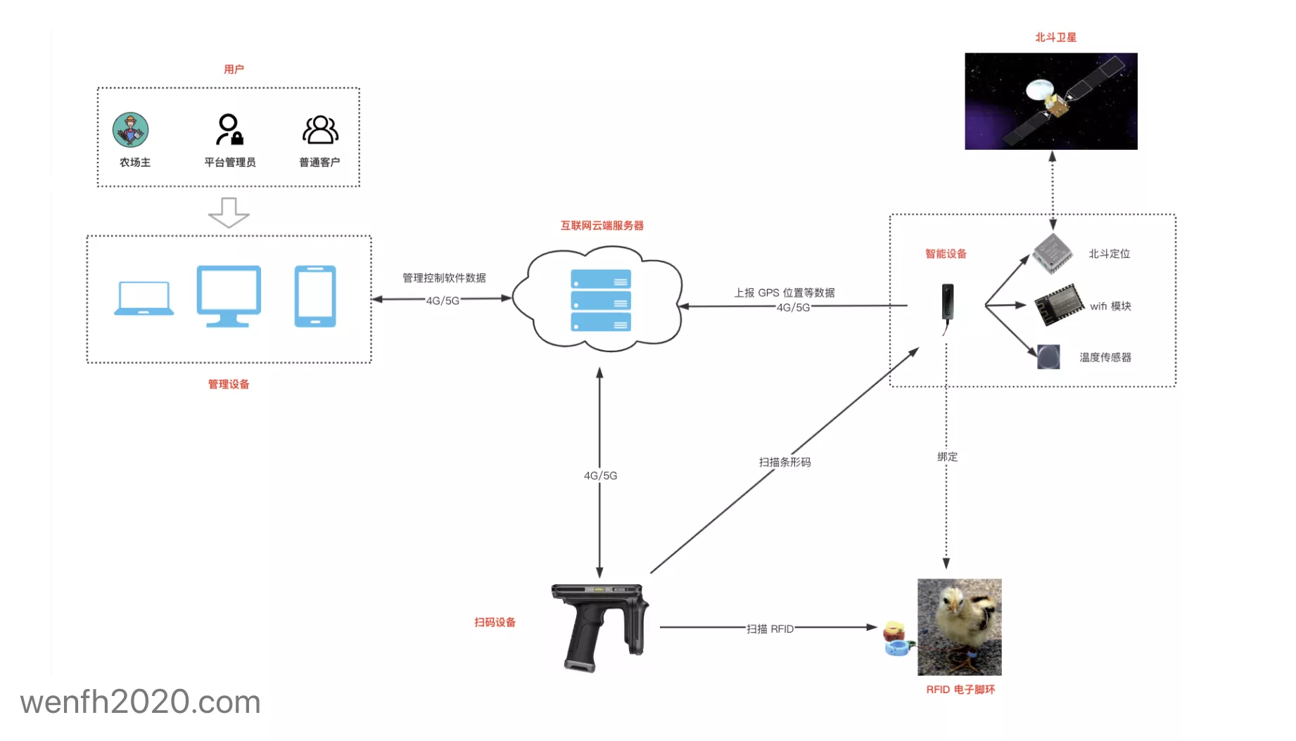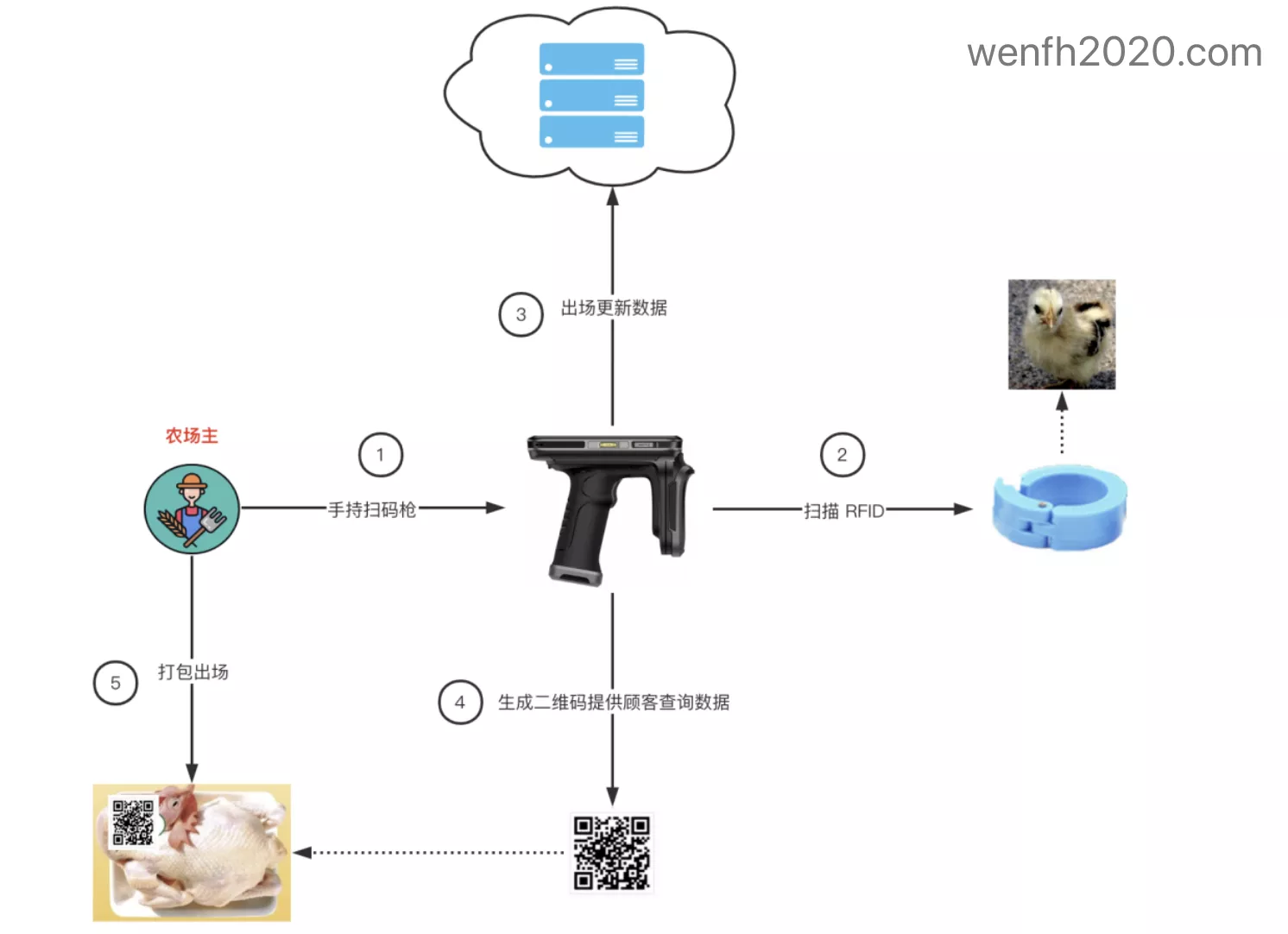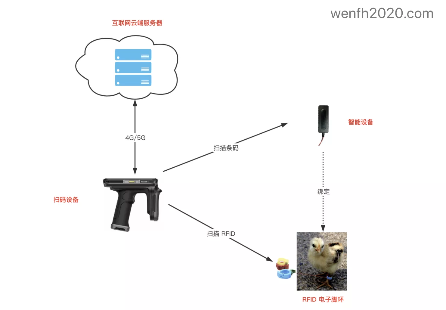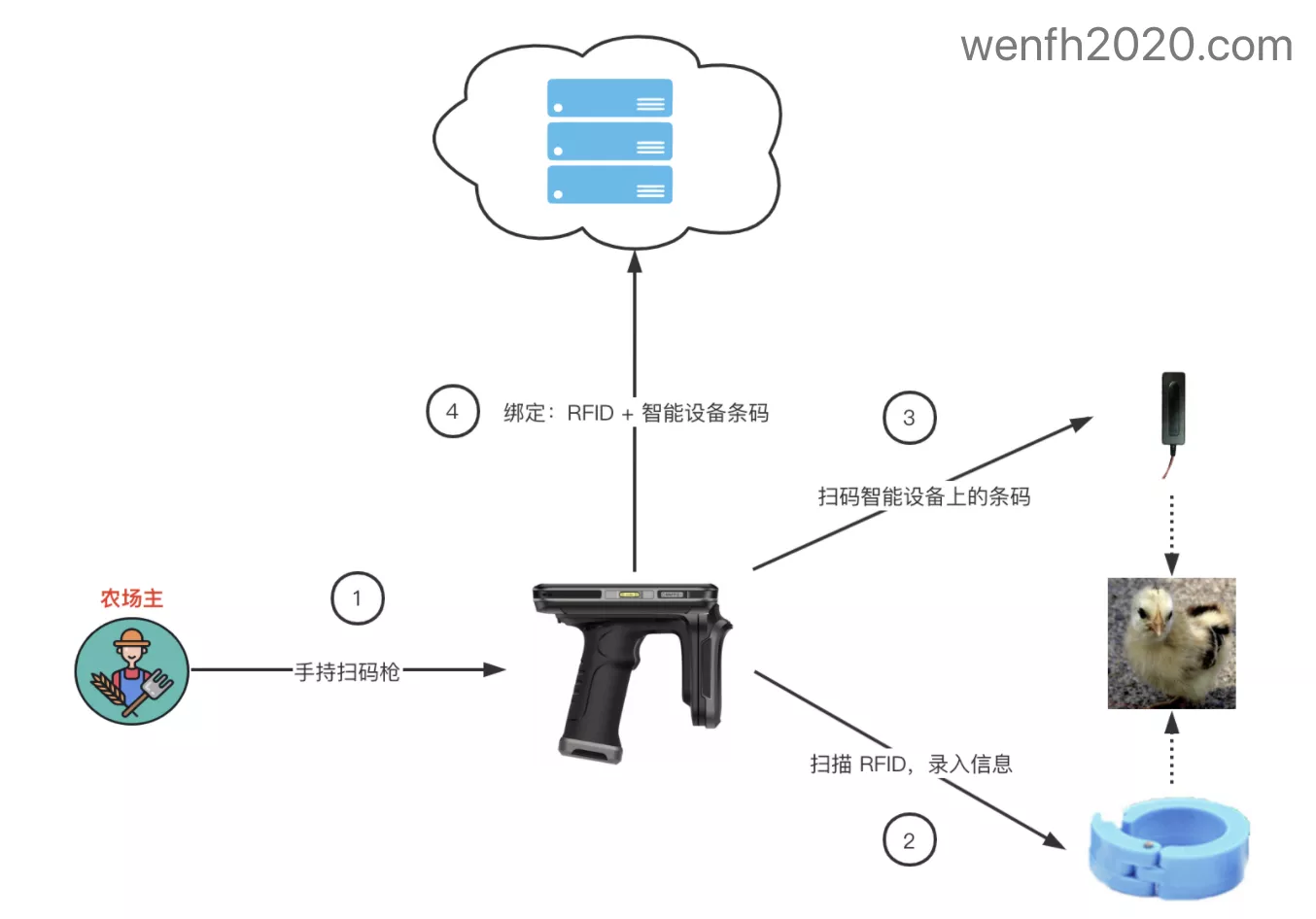 农场主可以通过设备:扫码枪 + 脚环(rfid)+ 智能设备,采集动物数据,通过手机,电脑软件管理对应的数据信息。