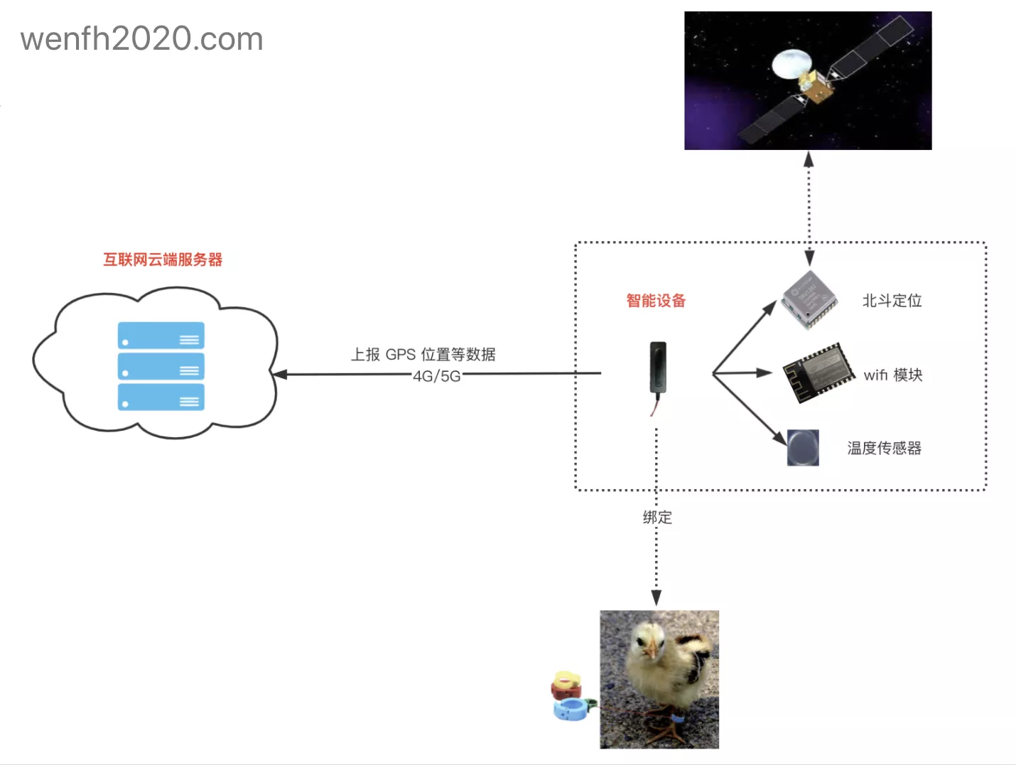 智能设备主要由:wifi 模组 + 定位模组 + 温度检测 三部分组成。设备采集动物对应数据,然后将数据上传到互联网云端服务。