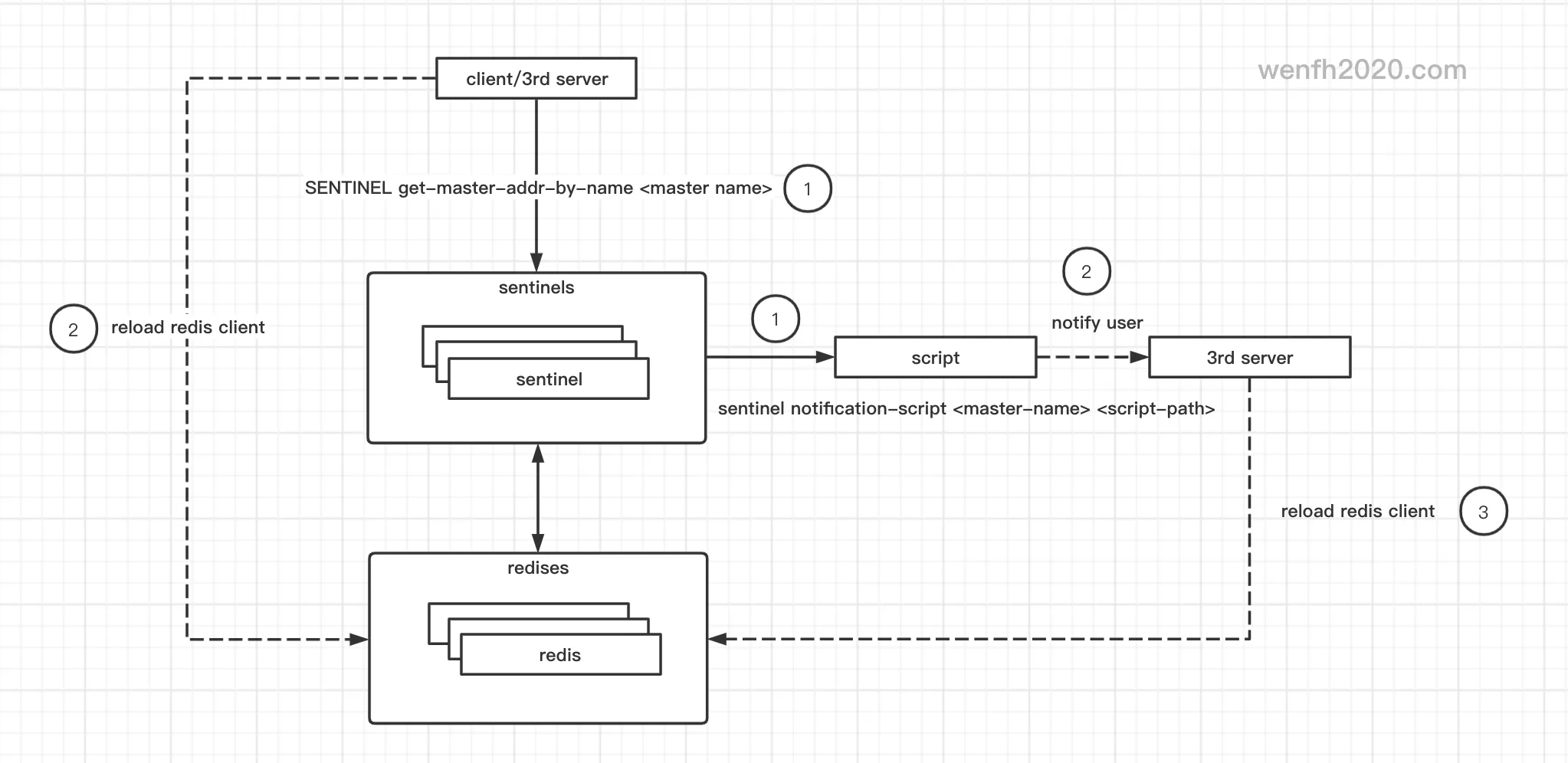 sentinel notification-script <master-name> <script-path>。 - 也提供了命令,提供 client 获取信息,例如
