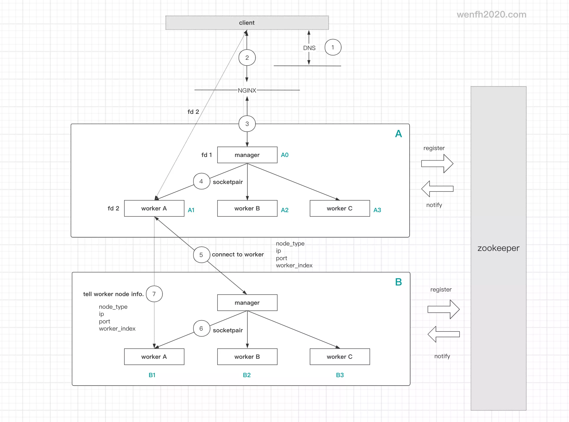 - B0 接收到 A1 发的数据,将 fd 透传给对应的子进程 B1,A1 与 B1 连接成功。(《[kimserver] 父子进程传输文件描述符》