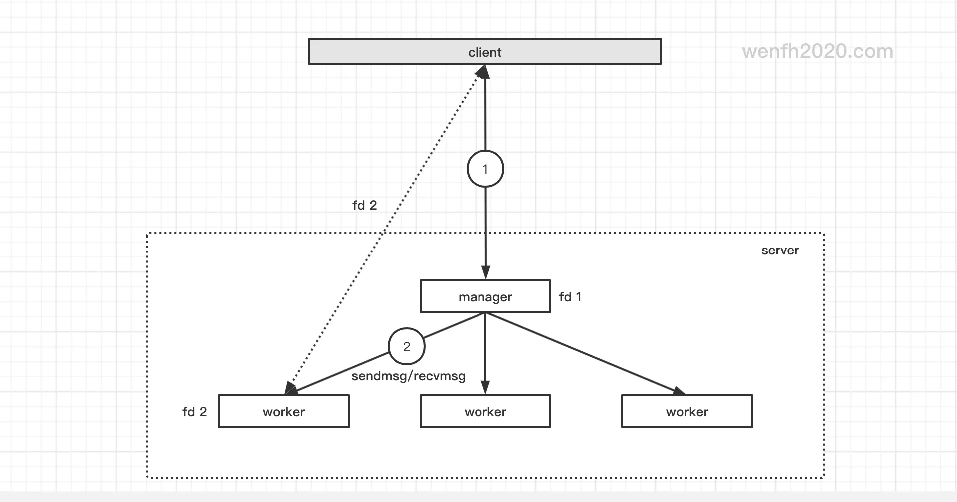 recvmsg接收主进程发送的 fd1。注意,这时候经过发送后的客户端连接文件描述符 fd1 已经发生改变,变成 fd2 了。 - 文件描述符传输完毕,客户端与子进程成功建立连接 fd2。