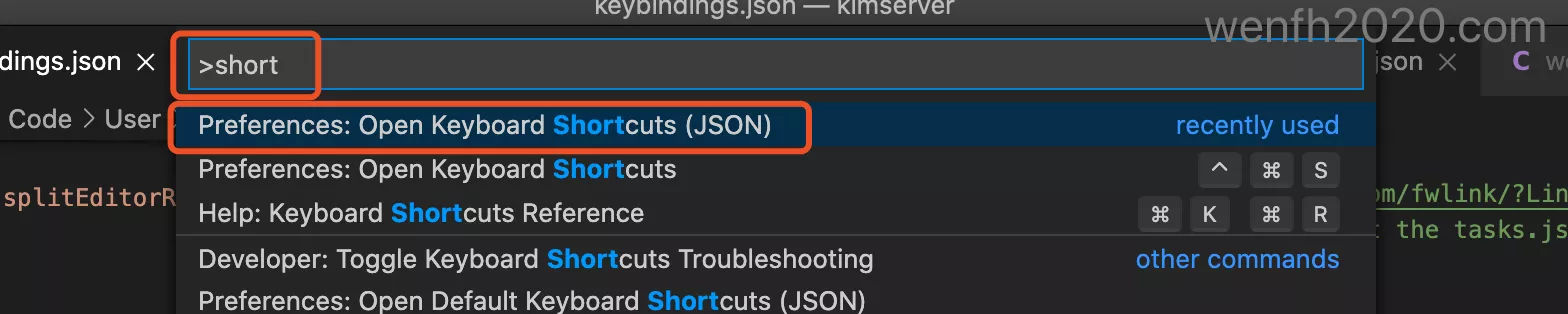 Preferences: Open Keyboard Shortcuts (JSON)选项。 - 步骤 1 随即会打开快捷键 json 文件:keybindings.json。