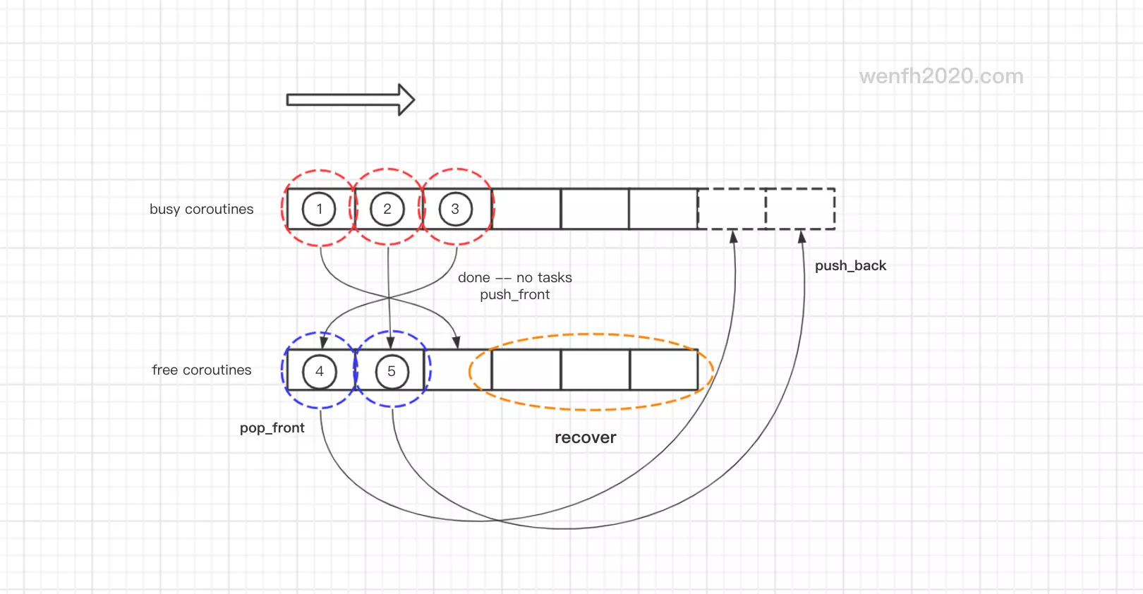 - 如果 free 链表有空闲连接,那么 manager 协程,取 free 链表头部连接,并将一定数量任务分配给空闲连接,然后将这个连接放进 busy 队列的尾部。