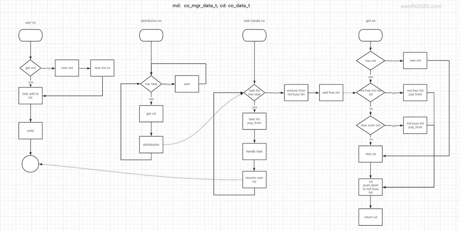 manager的任务队列,然后用户协程切出去等待唤醒。 manager协程主要负责链接调度,还有任务分派,它将一定数量的任务分配给比较空闲的连接处理。- 任务处理协程,被分派到任务,开始处理任务。
