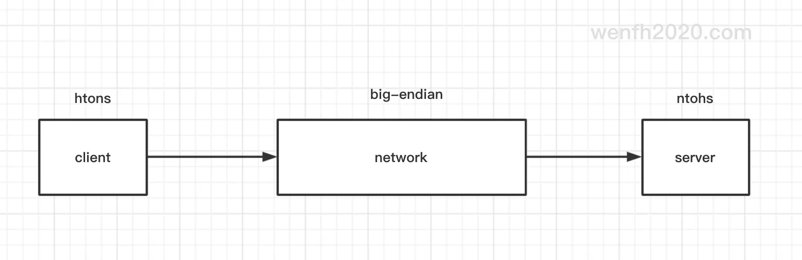 举个 🌰:client 与 server 通信,16 位整数字节序转换流程:htons –> 网络字节序(大端) –> ntohs。