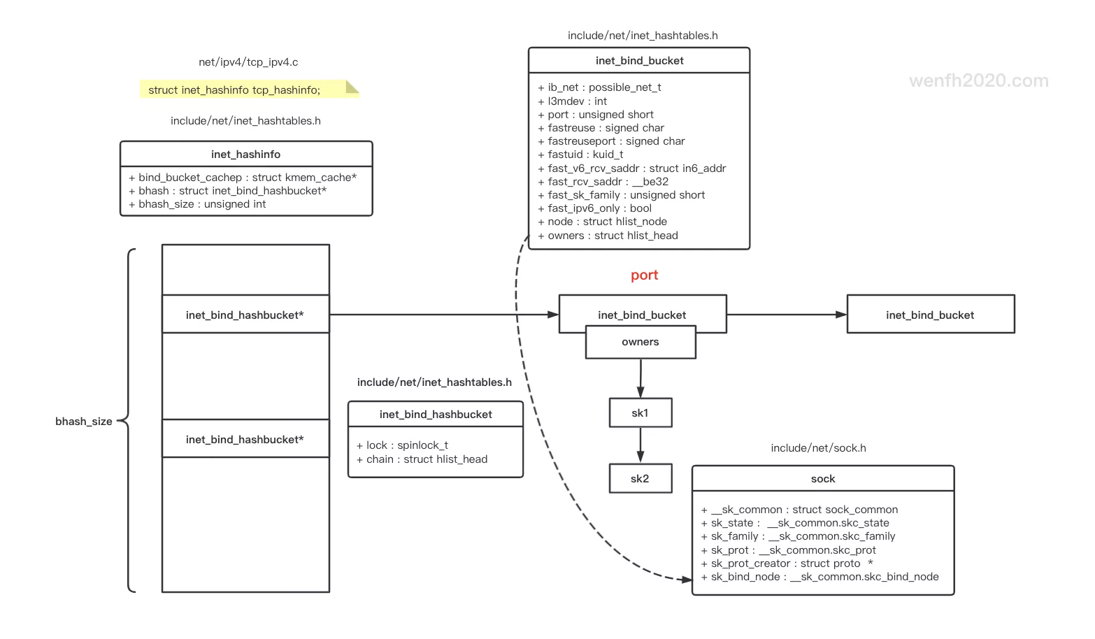 inet_bind_bucket里。所以inet_bind_bucket要使用fastreuse和fastreuseport去优化,尽量避免链表遍历。