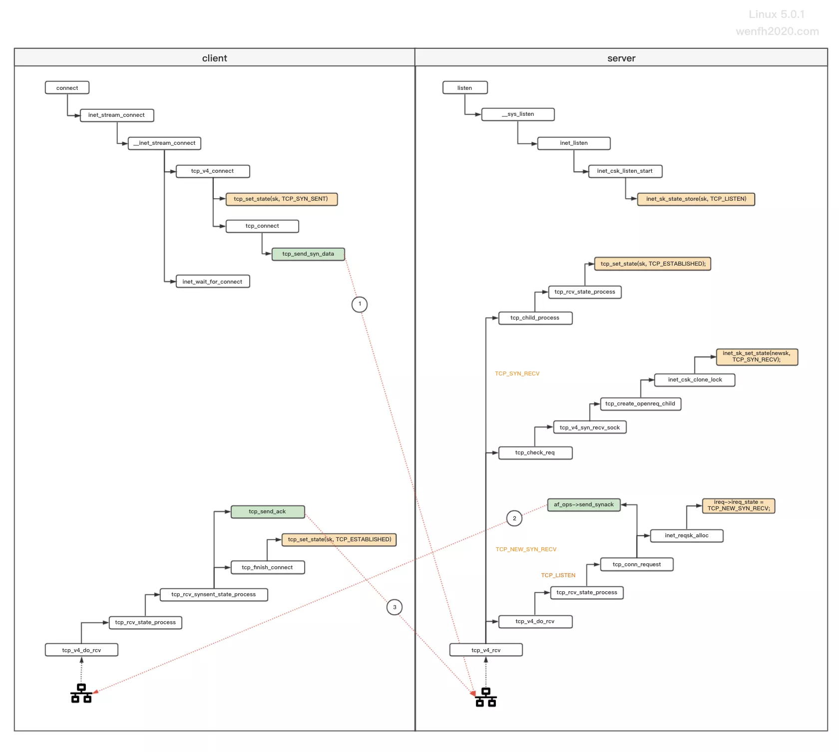 因为我走读的是 Linux 5.0.1 源码,与旧版的 Linux 3.x 系列比较,新版的三次握手的状态已经发生改变,这个需要注意一下。