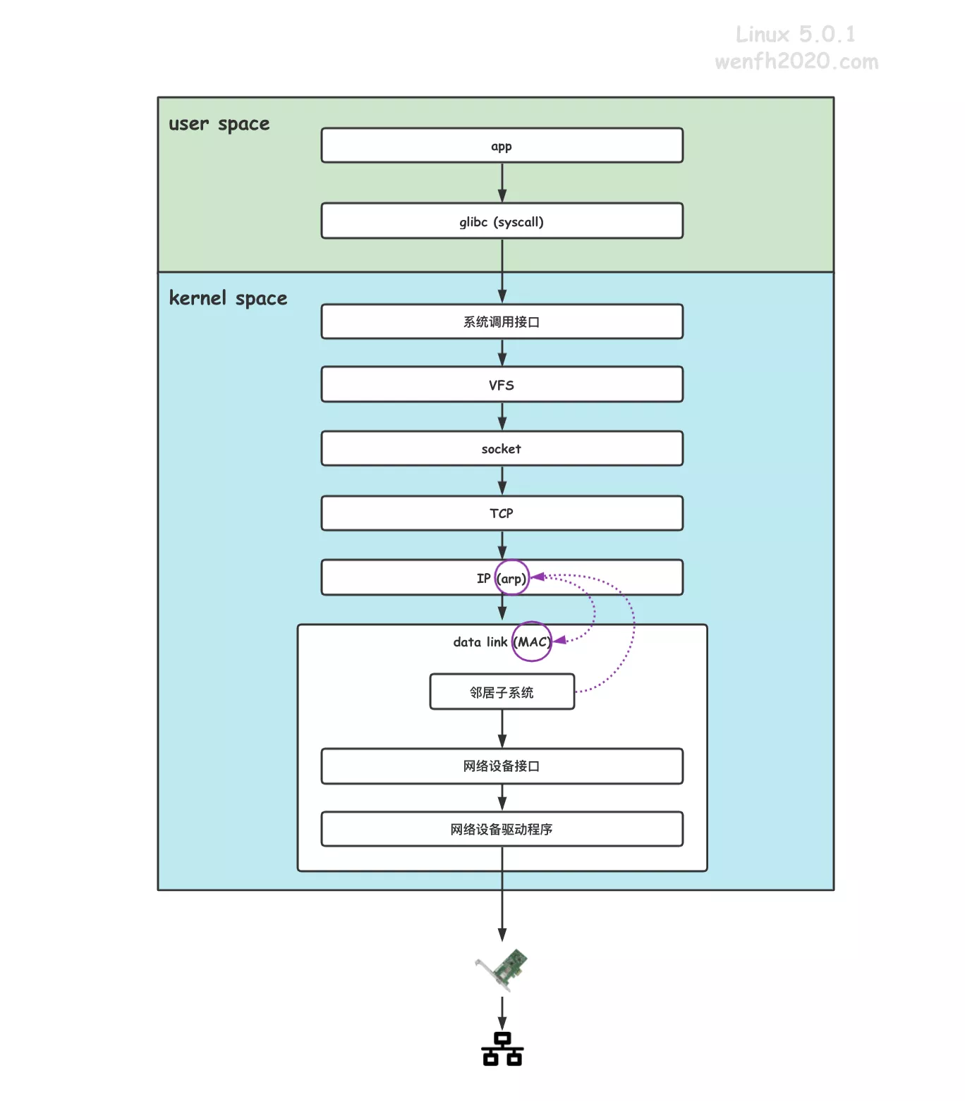 而数据发往下一跳的 MAC 地址,需要发送 arp 报文获取,这些操作会在 邻居子系统 里实现。然后,数据再从 MAC 层通过 dev_queue_xmit 发往设备层。