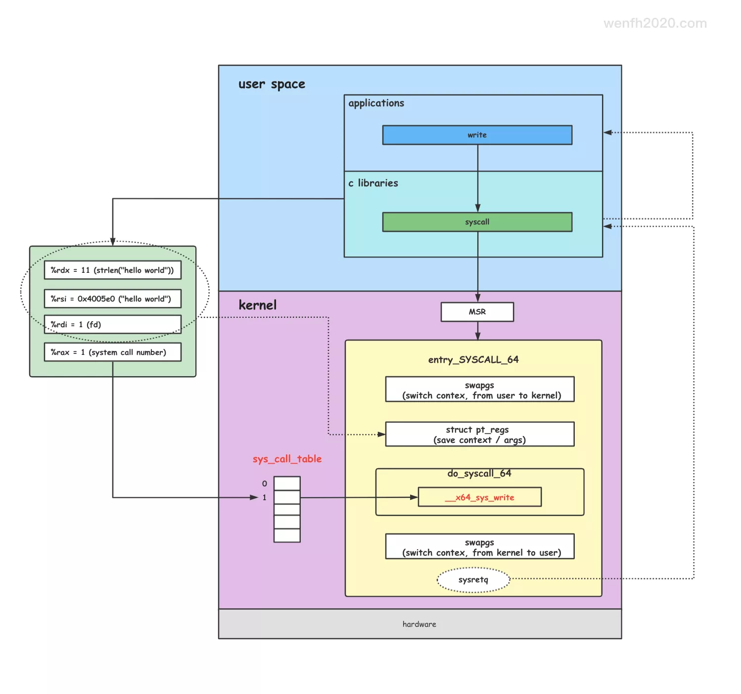 syscall's number -> syscall -> entry_SYSCALL_64 -> do_syscall_64 -> sys_call_table -> __x64_sys_write