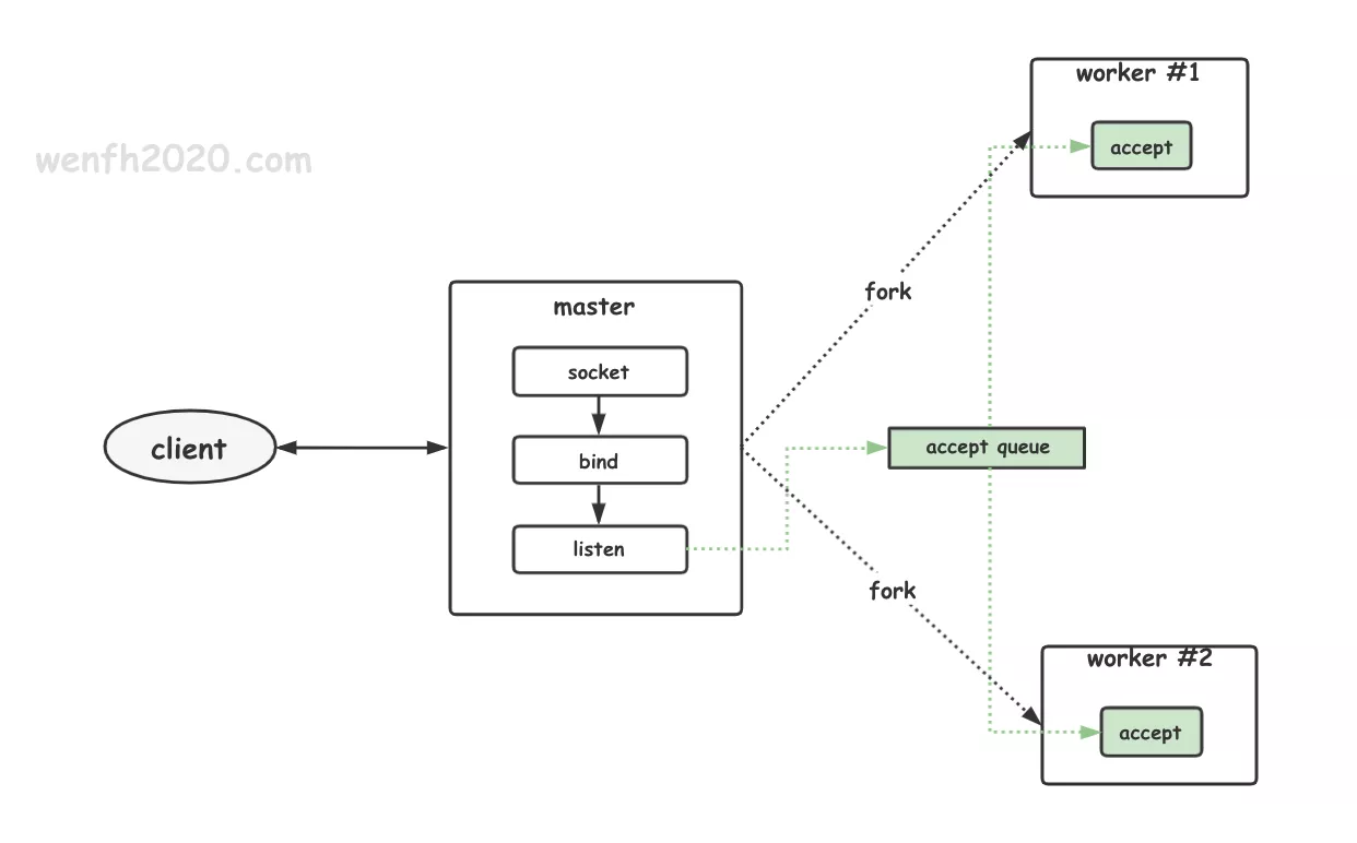正常的同步服务程序,会启动多个进程(worker #1 / worker #2)进行 accept 新的链接。