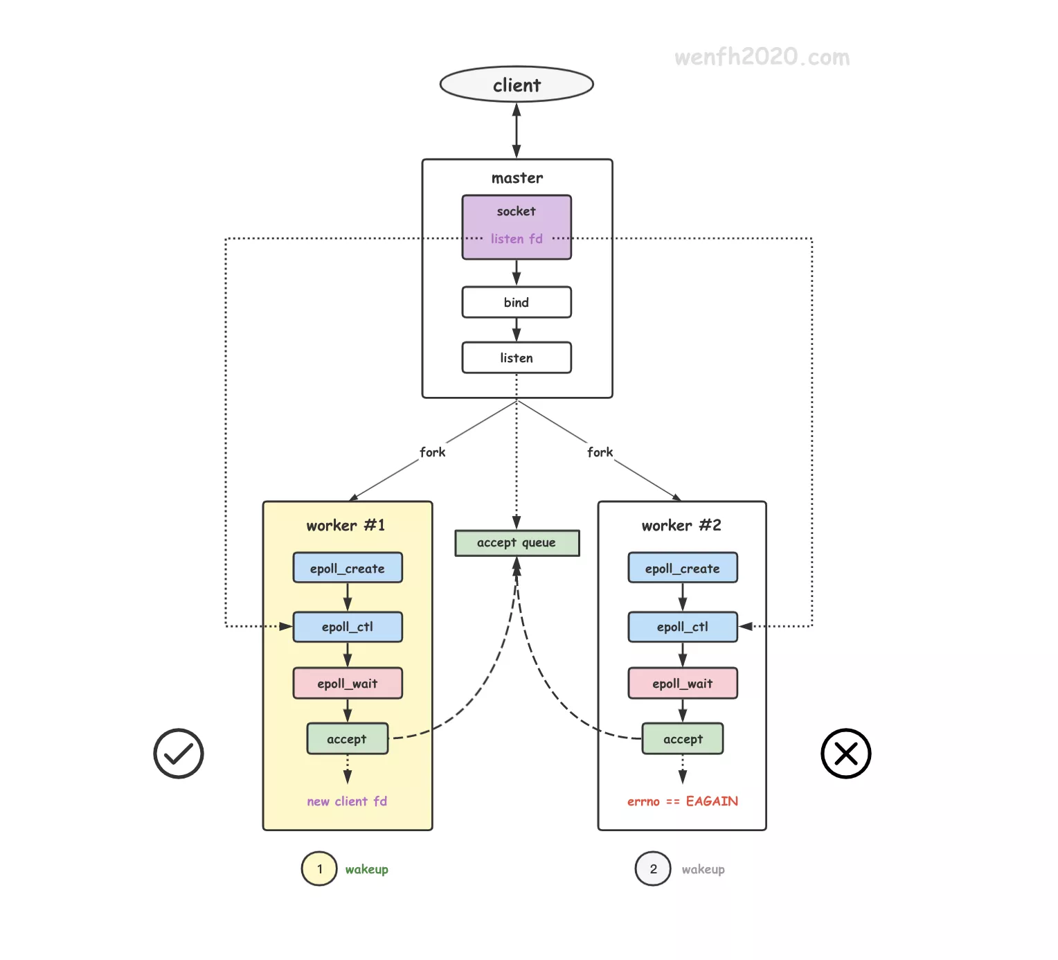 # 子进程被唤醒后,accept4 获取链接资源失败,返回 EAGAIN。