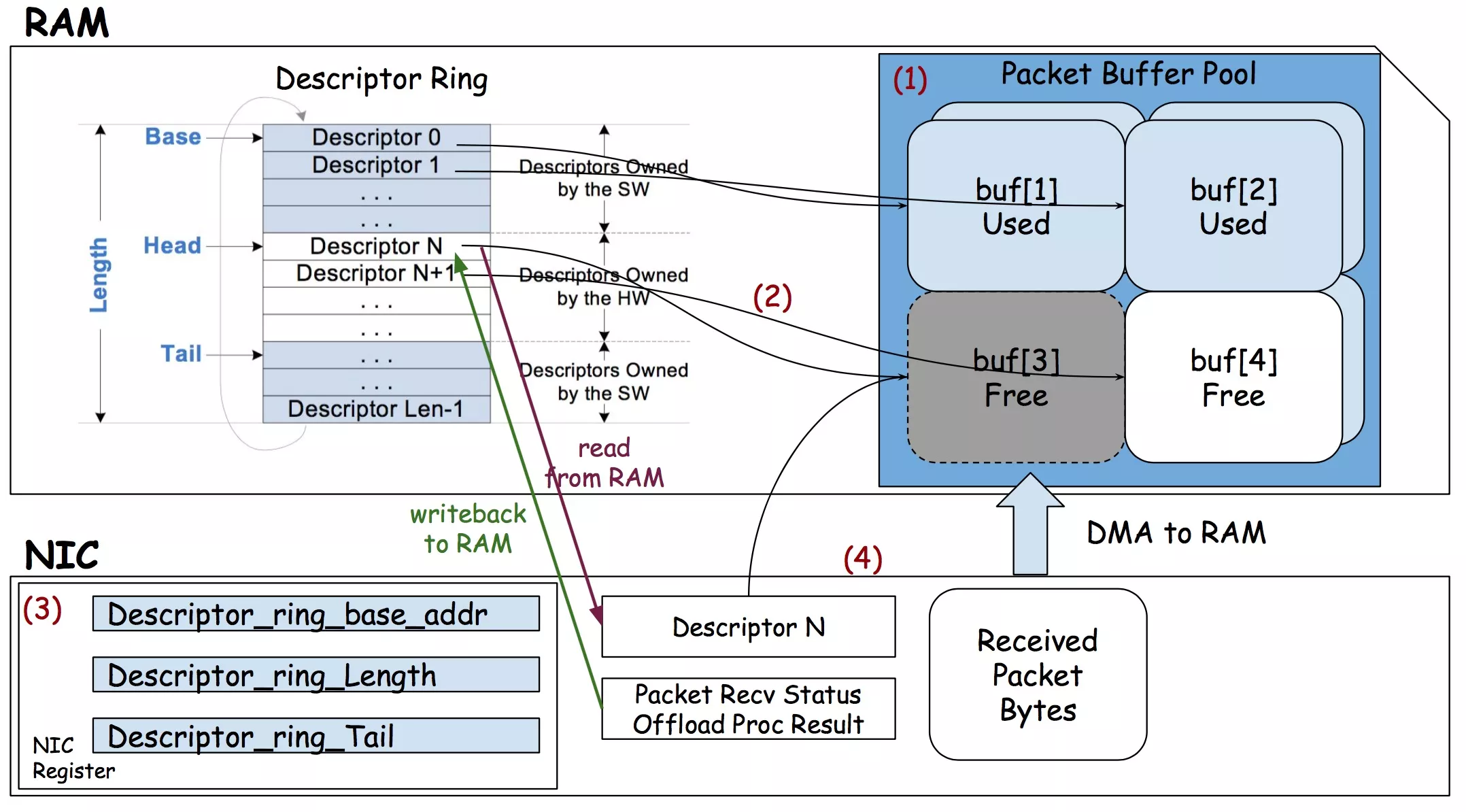 - 网卡驱动(NIC driver)启用软中断,消费主存上的数据。