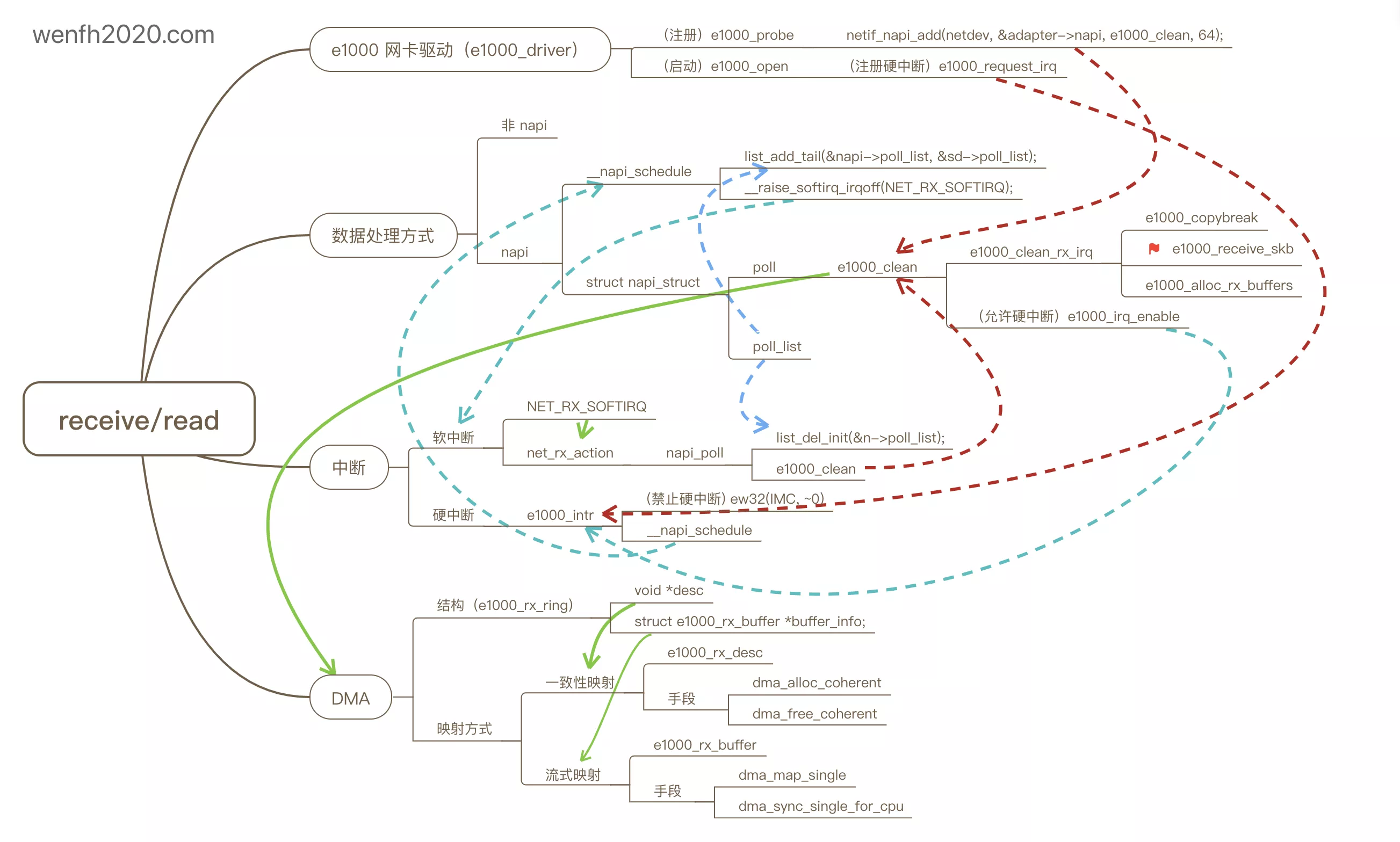- 内核软中断遍历 softnet_data.poll_list,调用对应的 napi_struct.poll -> e1000_clean 读取网卡 DMA 方式写入主存的数据。