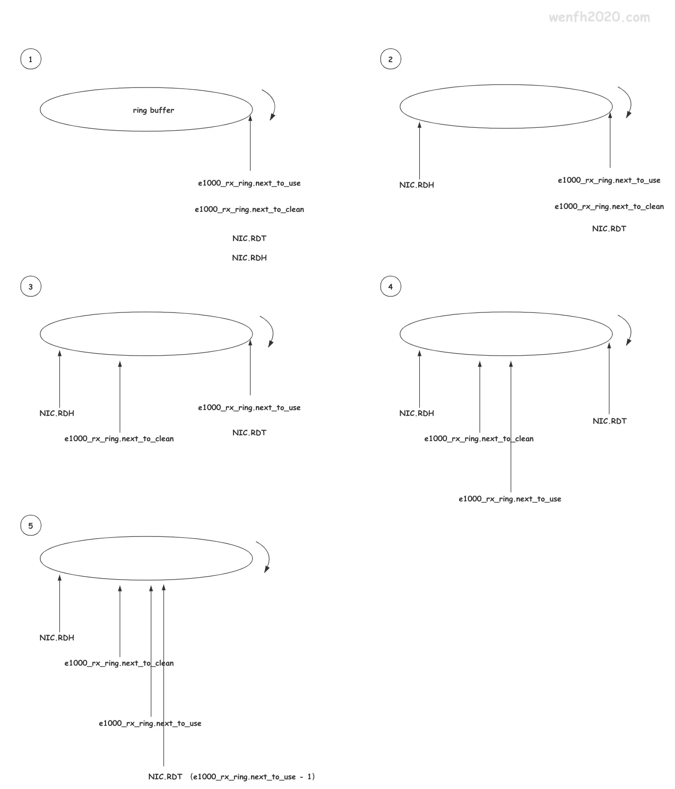 - 初始状态,下标都指向数组一个元素 e1000_rx_ring.desc[0]。