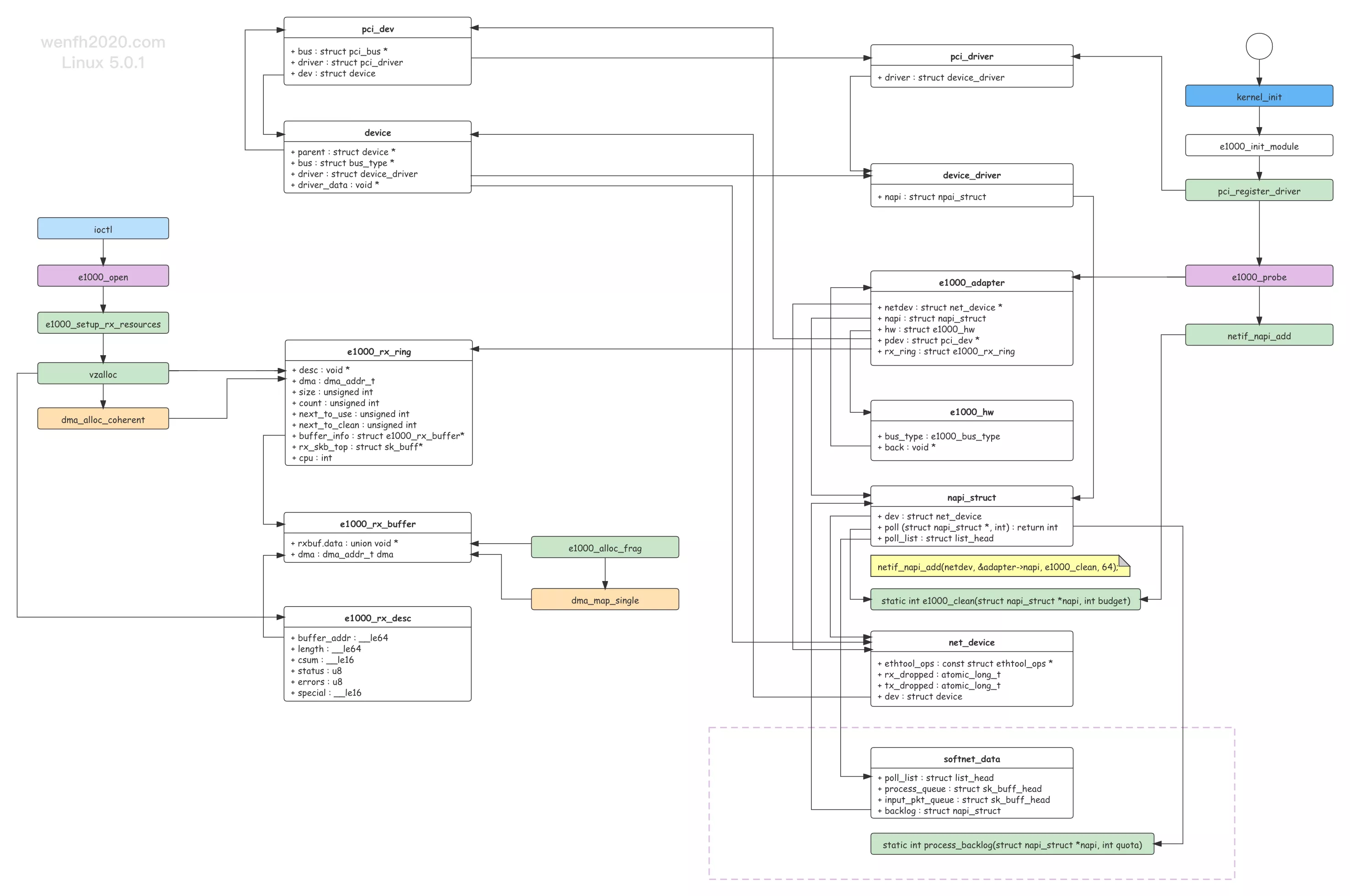驱动注册(e1000_probe)到内核,启动网卡(e1000_open),为网卡分配系统资源,方便内核与网卡进行交互。