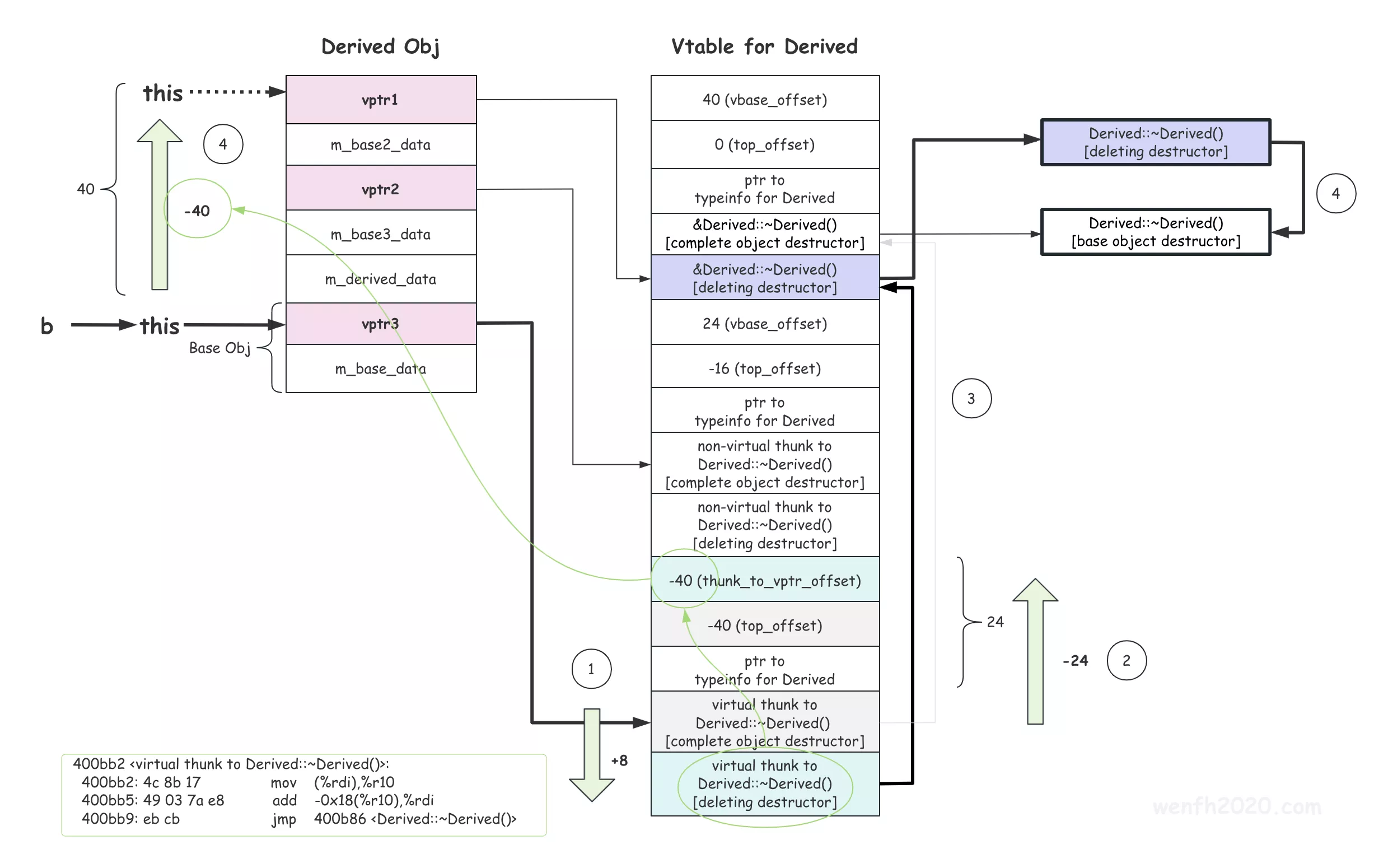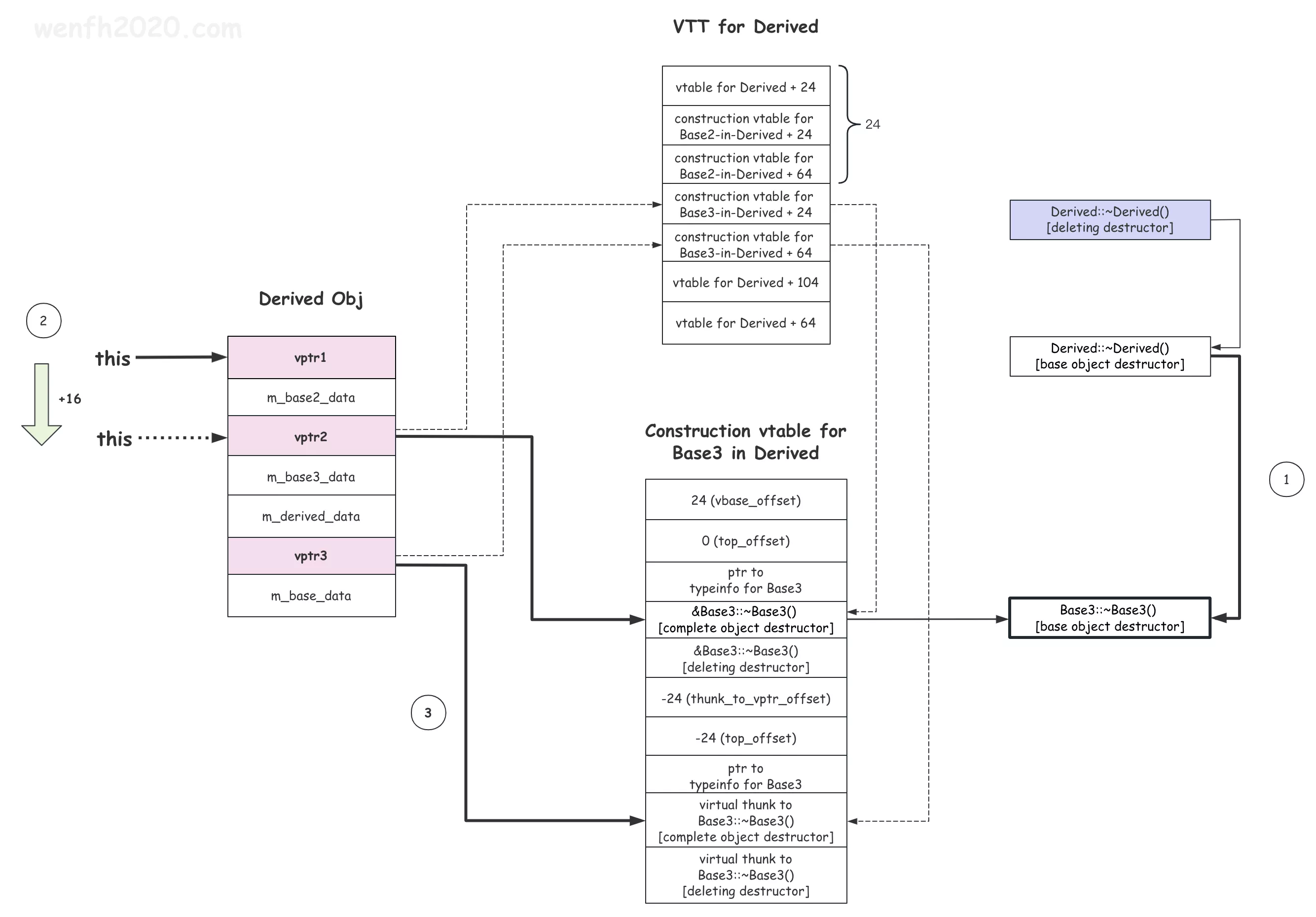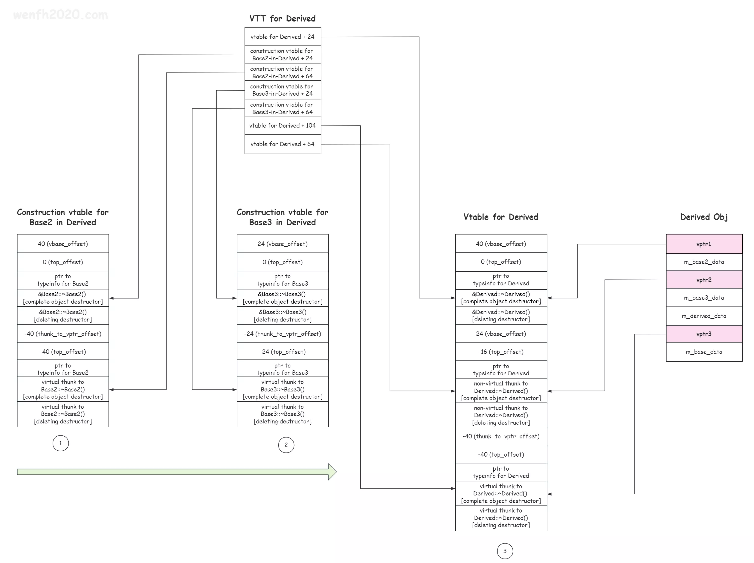 - 编译器为虚拟继承增加了一个 VTT (virtual table table),它协调构造出了 Derived 的虚表(详看下图)。
