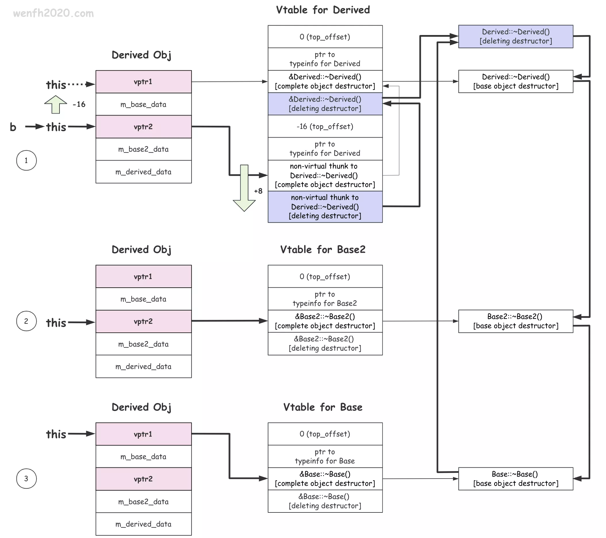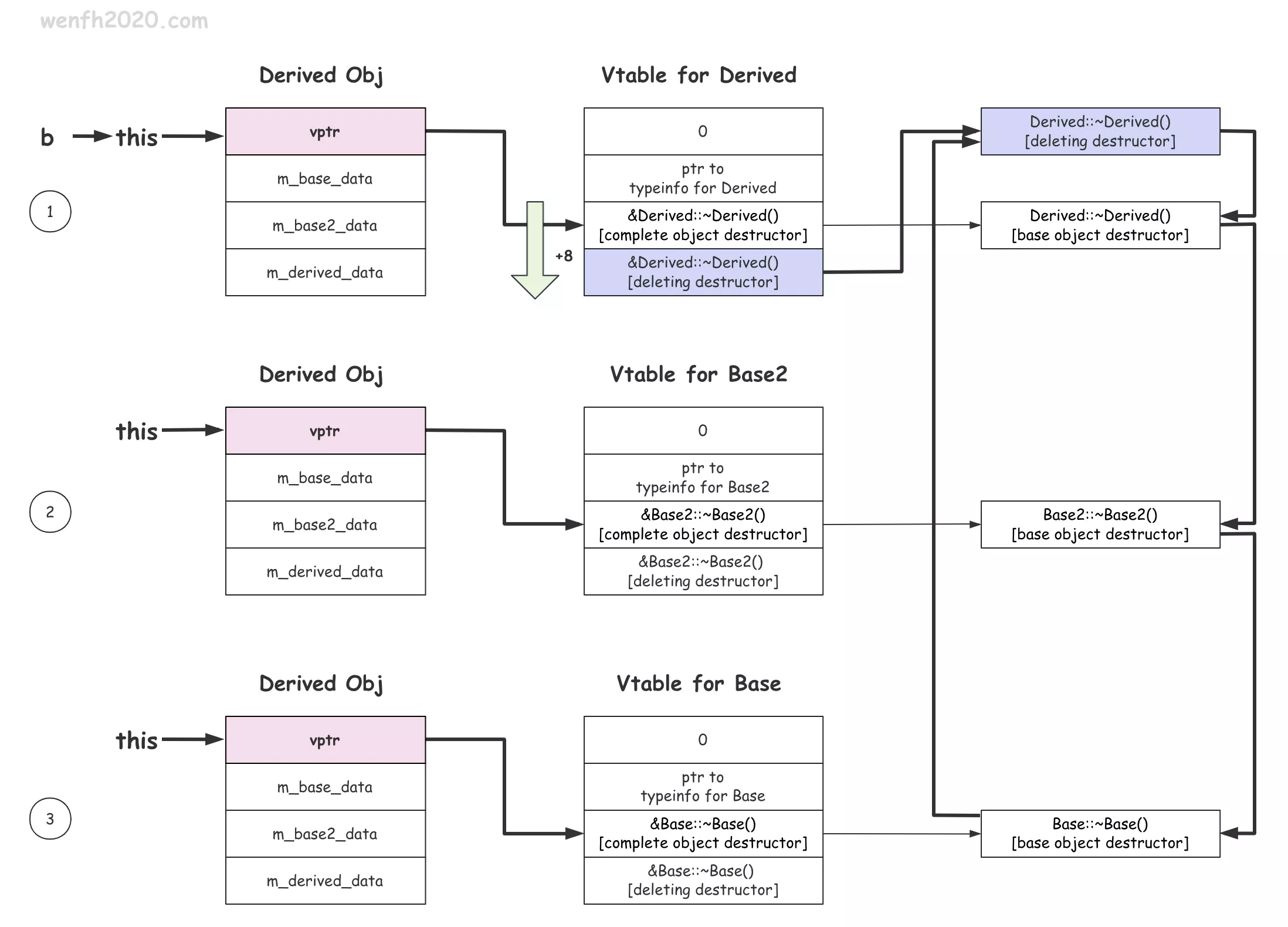 虽然虚拟继承内存布局有一些特殊,但对象的整体析构流程与其它继承关系的对象析构流程并没有多大区别。