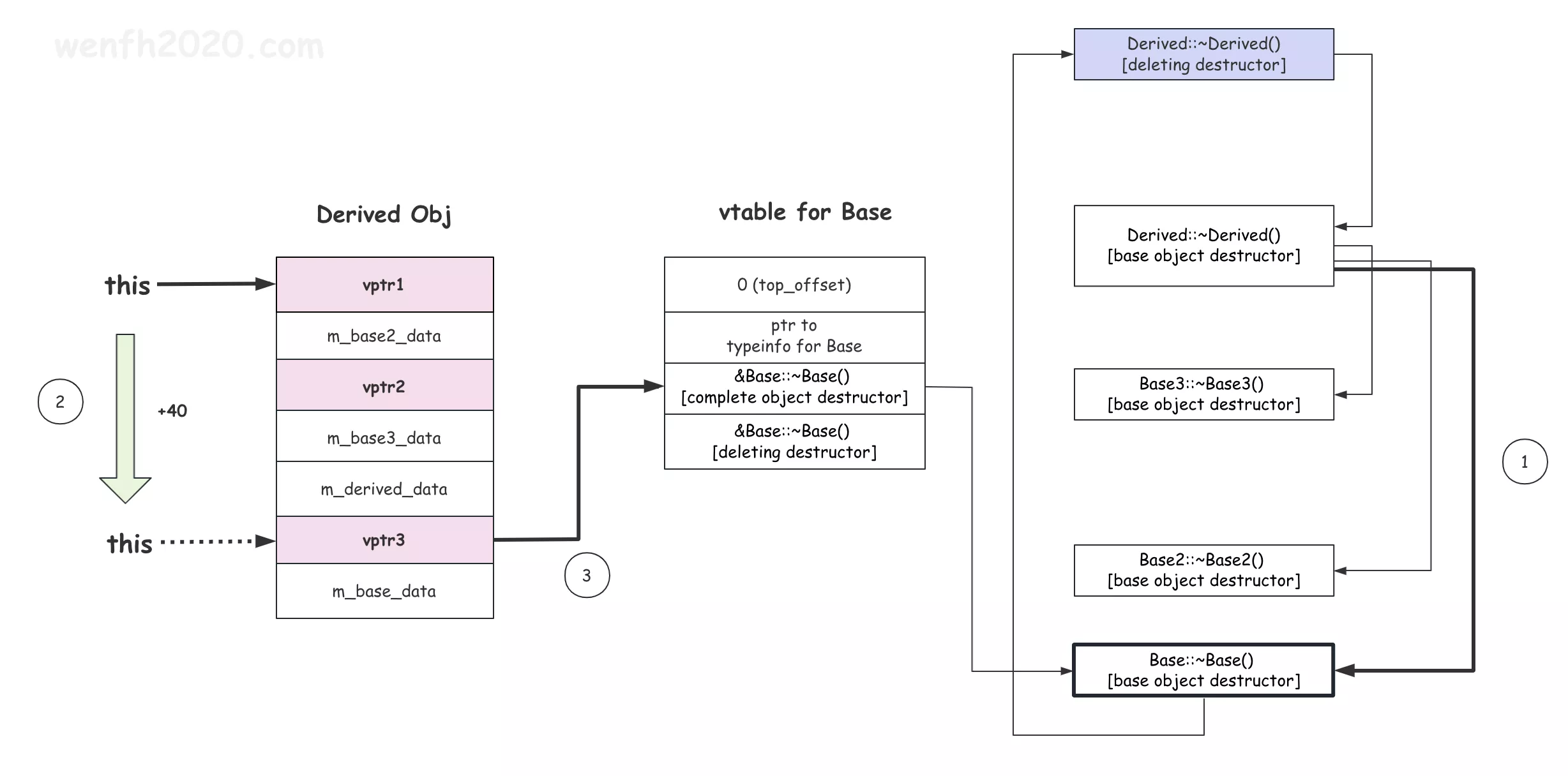 # Derived 完全对象析构函数,重置对象的 this 指针和虚指针,虚指针指向对应的虚表。