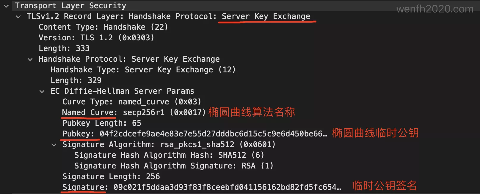 | 4 | S —> C | 第二次 | Server Key Exchange | 1. 服务端生成 椭圆曲线私钥 ==> 生成 椭圆曲线公钥 ==> 服务端的 RSA 私钥实现 椭圆曲线公钥签名。2. 服务端发送:椭圆曲线算法信息, (服务端的)椭圆曲线公钥,(服务端的)椭圆曲线公钥签名 给客户端。 |