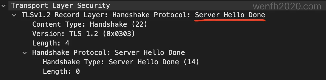 | 5 | S —> C | 第二次 | Server Hello Done | 服务端发送确认给客户端,已完成 Hello 阶段流程。 | ![]() |
