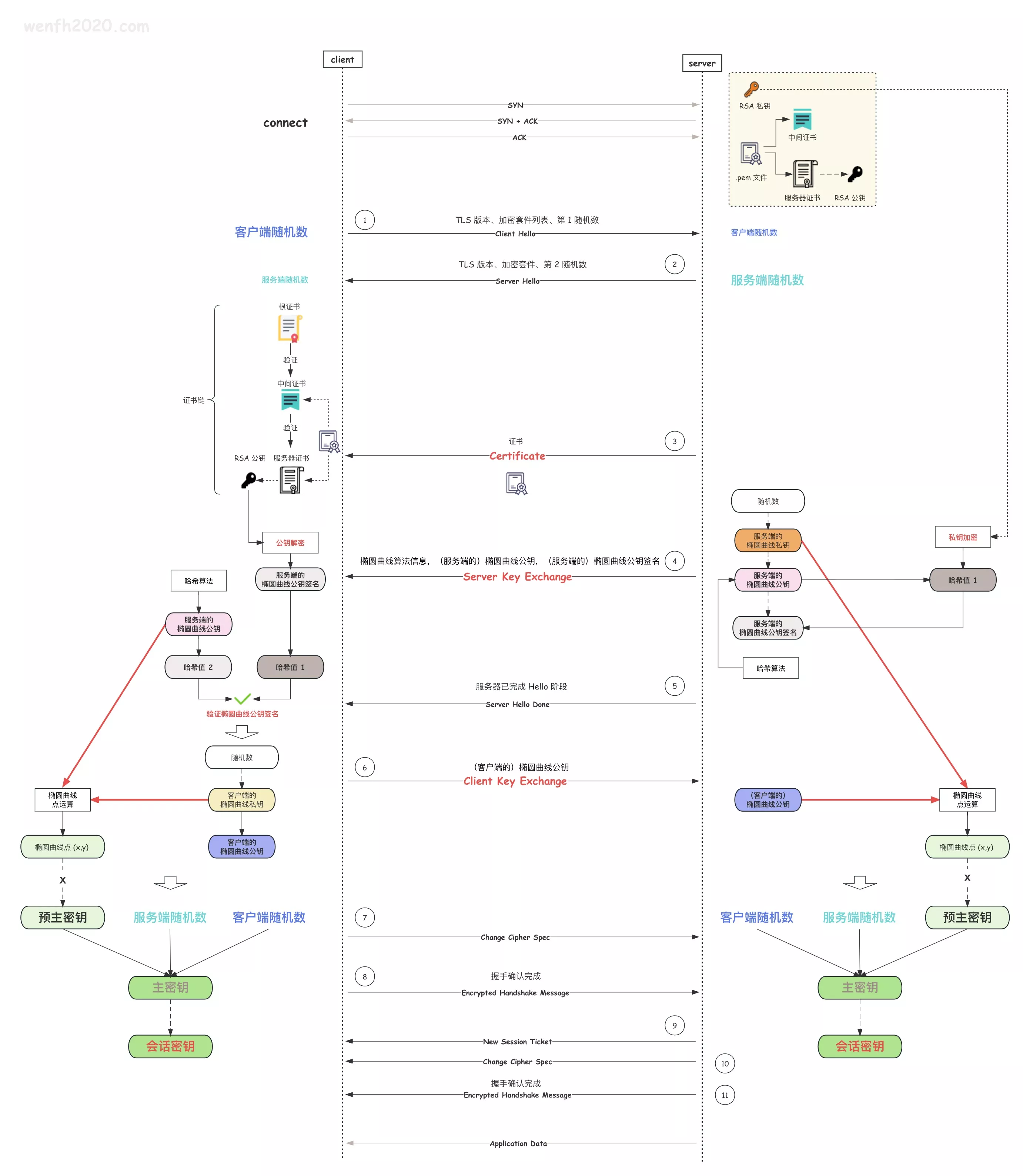 椭圆曲线私钥(随机数),并使用椭圆曲线算法生成对应的椭圆曲线公钥。 - 在握手阶段,客户端和服务器互相交换