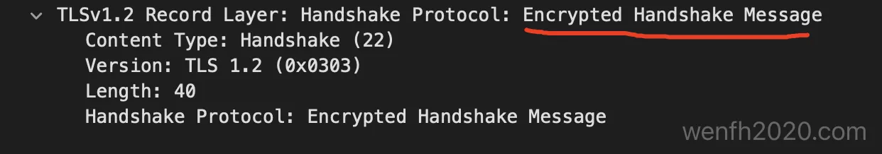 | 11 | S —> C | 第四次 | Encrypted Handshake Message | 服务端将之前的握手数据(发送和接收)做一个摘要,再用会话密钥(对称密钥)加密摘要数据,将密文发送给客户端,确认握手过程的完成。 | ![]() |