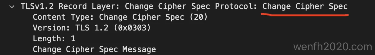 | 10 | S —> C | 第四次 | Change Cipher Spec | 服务端接收到客户端生成的 椭圆曲线公钥,也协商出共享的 会话秘钥,并通知客户端表示之后的消息都将使用新的密钥。1. (服务端的)椭圆曲线私钥 和 (客户端的)椭圆曲线公钥 通过点运算计算出新的点 (x,y),取 x 作为 预主密钥。2. 客户端随机数 + 服务端随机数 + 预主密钥 = 主密钥 ==> 会话密钥。3. 服务端的会话密钥已协商出来,服务端发送确认给客户端。 |