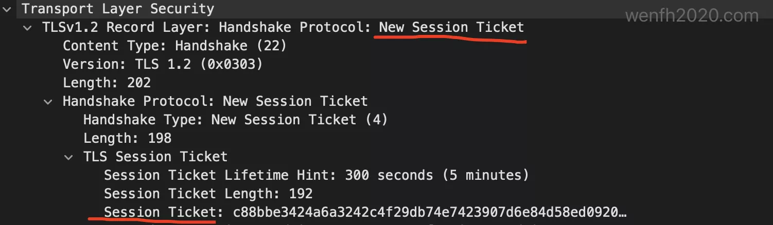 | 9 | S —> C | 第四次 | New Session Ticket | 服务器发送该消息给客户端,包含一个新的会话票据,用于快速恢复会话,避免重复握手。 | ![]() |