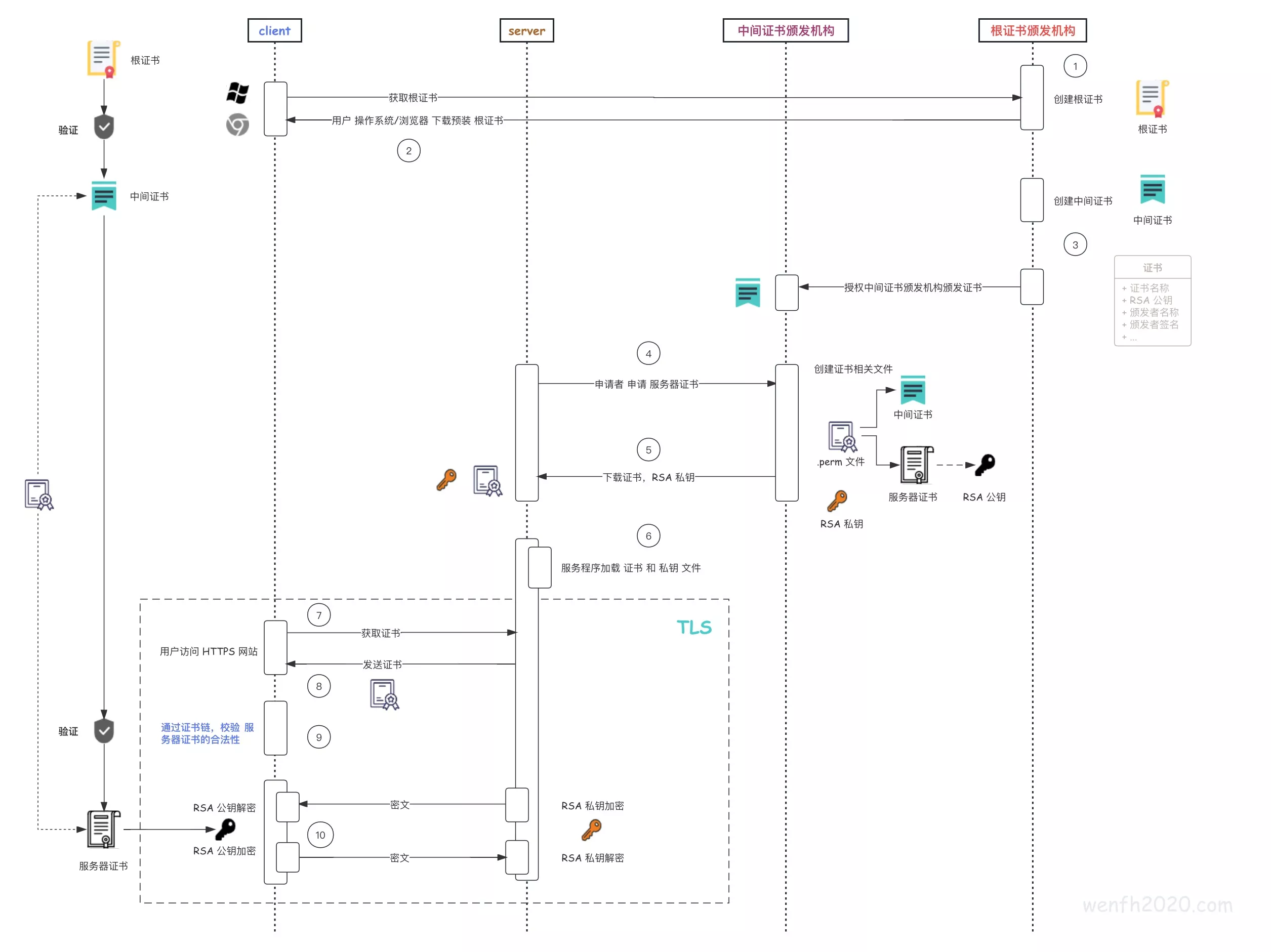 - 个人或公司向 中间证书颁发机构 申请一个 服务器证书,中间颁发证书机构 接受申请,创建证书文件:包含 RSA公钥 的服务器证书文件和 RSA私钥 文件;有些 PERM 证书文件会将 中间证书 和 服务器证书 打包在一起。