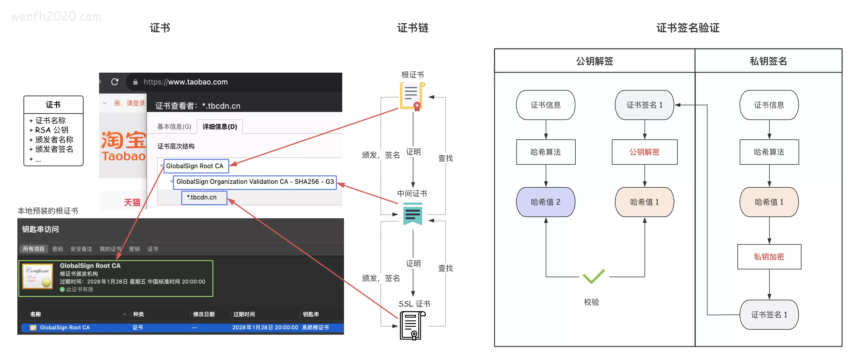 - 客户端获得服务器证书后,通过 证书链 对该服务器证书进行校验。因为之前用户的计算机系统或浏览器已经预装了根证书,那么证书链验证:根证书验证中间证书合法,中间证书验证服务器证书合法。