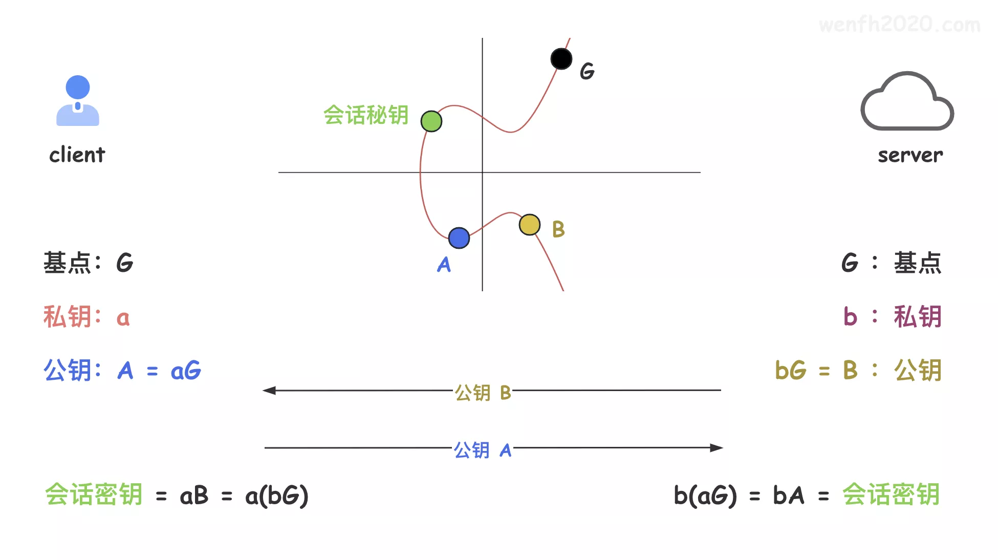 - 此时双方都生成了会话密钥,根据乘法交换律 a(bG) = b(aG) 推出 aB = bA = 新密钥(点),也就是说双方的新密钥是相同的,这就是协商出来的