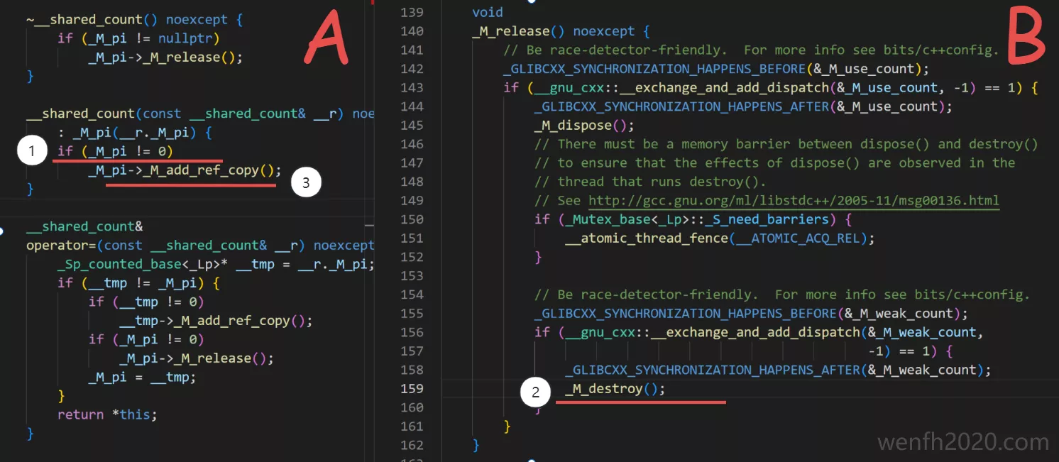 - B 线程执行骤二:释放 _M_pi 指向的控制块内存。